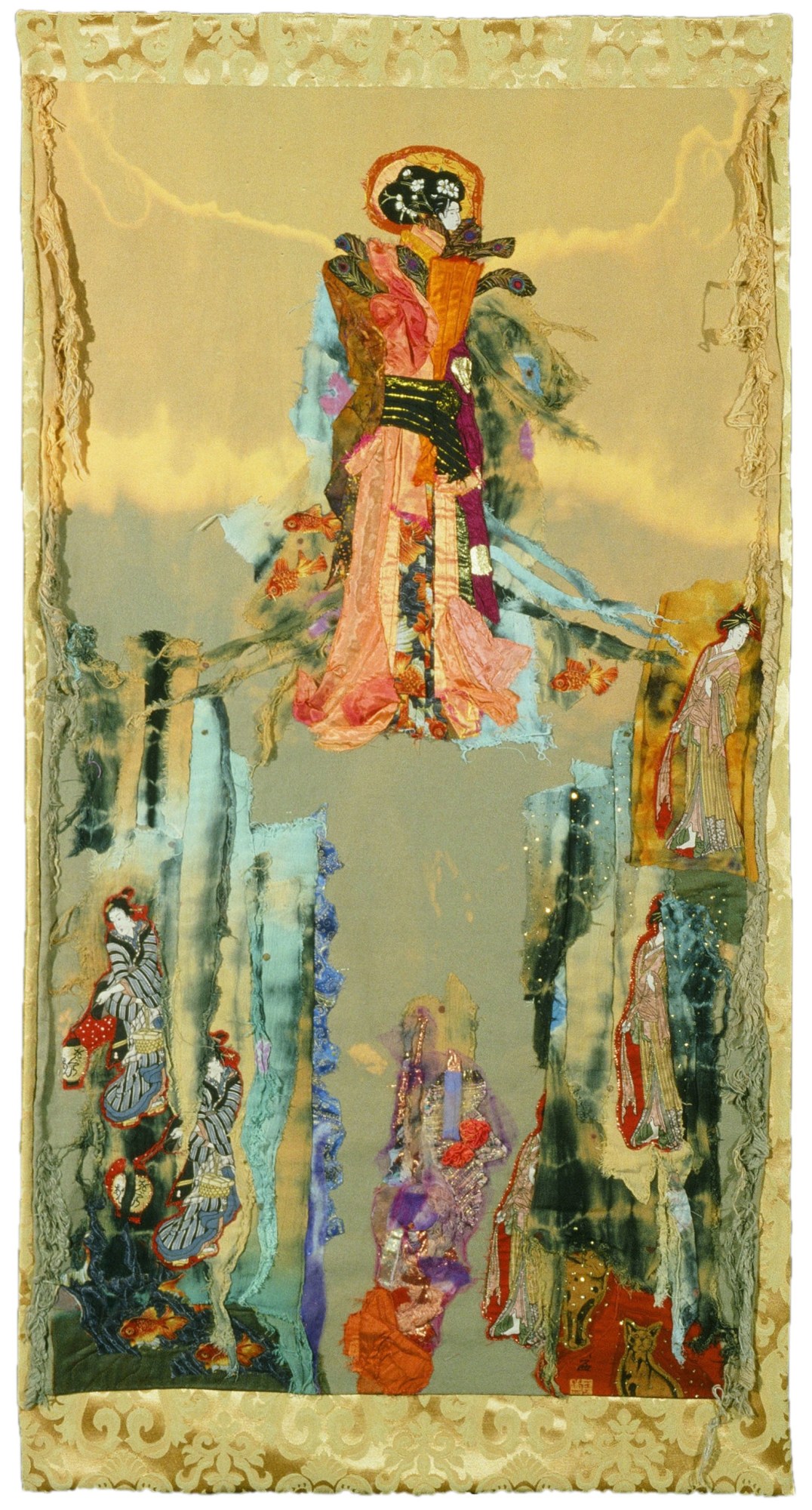 Artist Statement: For the background cloth, I experimented with pouring some bleach across the fabric, and I got that nice golden line that reminded me of a horizon line. When I washed the cloth afterwards, the threads on the ends got into nice tangles and I decided to keep them that way. I like to use my imagination, so the Geisha women are peaking through columns of cloth and the central figure in the sky, with fish swimming about her feet.