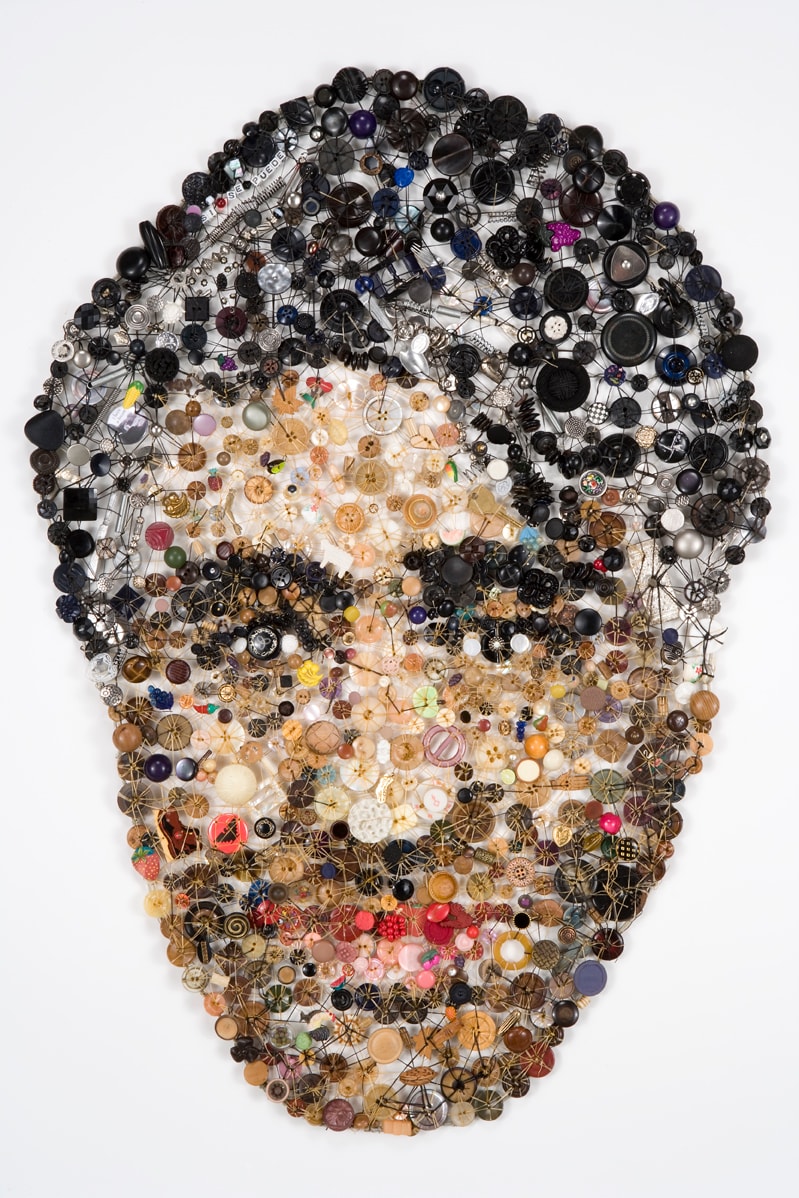 - Buttons, beads, imitation sinew, found objects, chicken wire, wire and spray paint