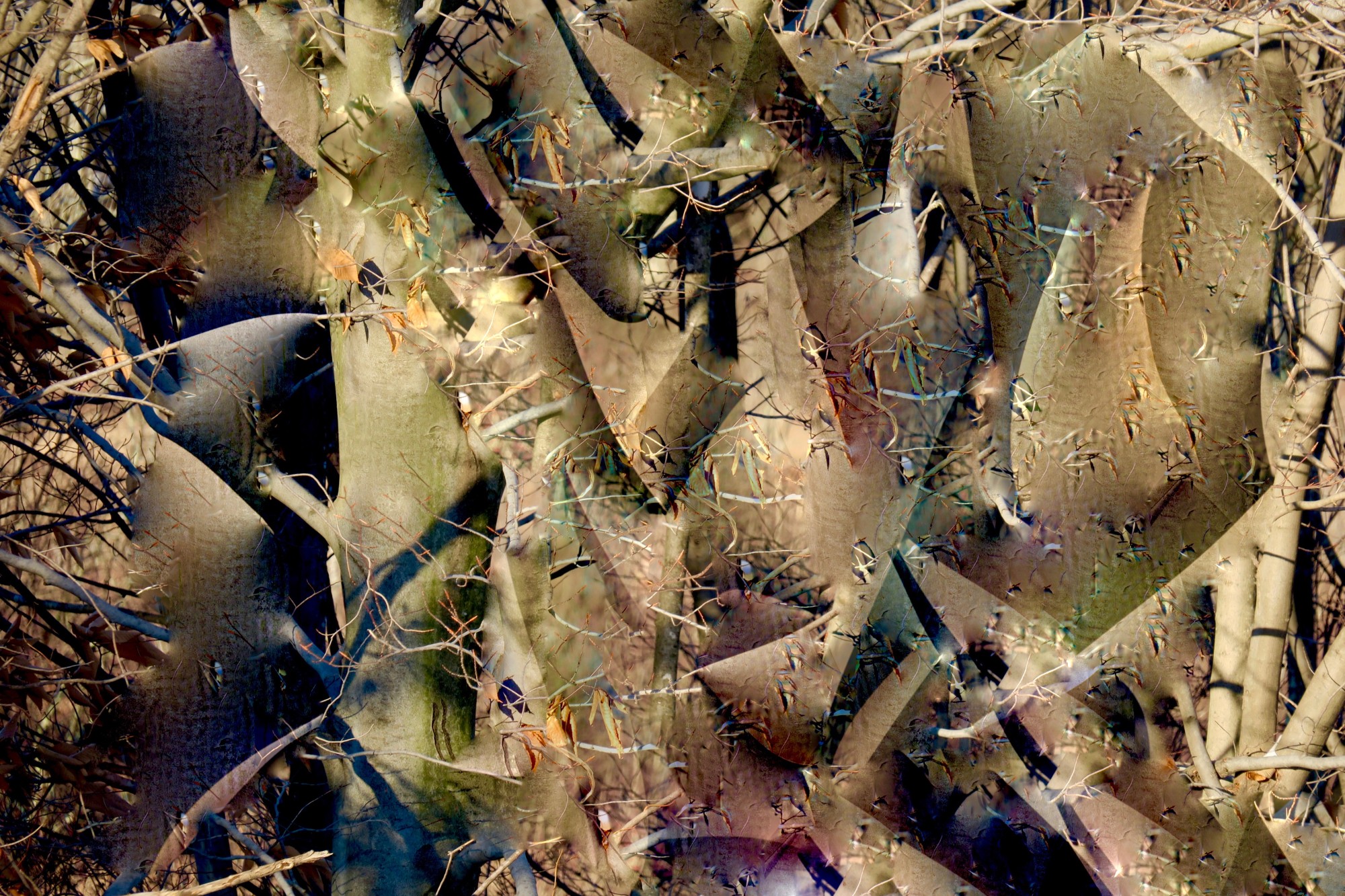 Crow is based on a photo of dense wood and underbrush that was then manipulated digitally to merge and create an overlay of abstract forms. I became fascinated by the play back and forth between the real branches, twigs and soft color of late Fall and early Winter, and the abstract forms that I developed by copying and merging with different sections of the image. This mono chromatic canvas is totally unique and beautiful..
