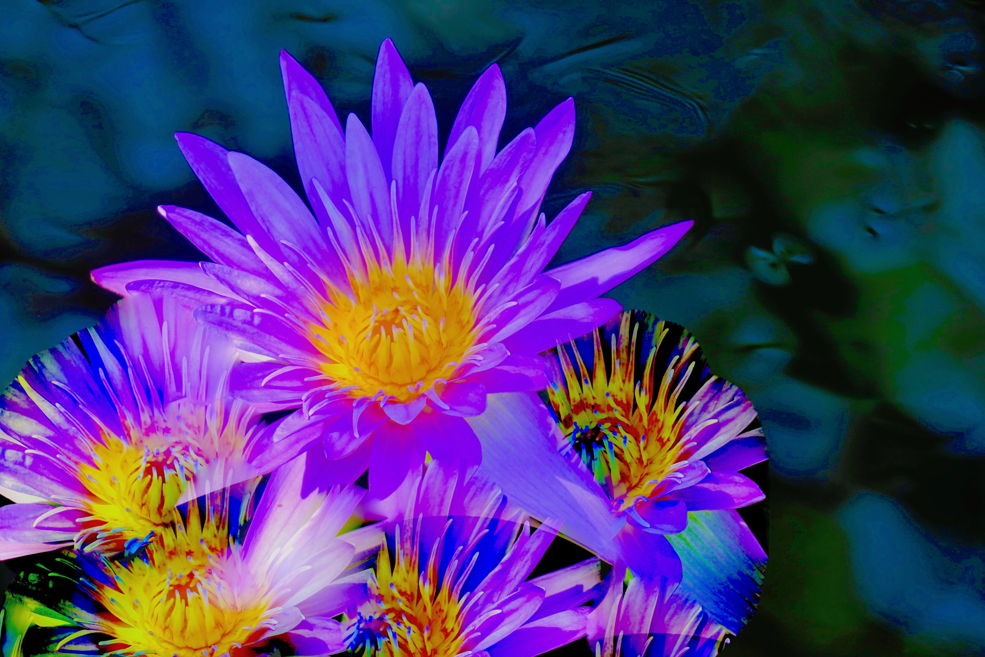 Lilies in Bloom is an abstraction of a single lily in a pond. The images on canvas were copied and the color shift is part of the copy process that provided a rainbow effect. The layering gives a delicateness to the image and shading. The dense color, subtle background have great clarity making the work interesting when viewed closely or from a distance. The piece is acrylic ink on canvas