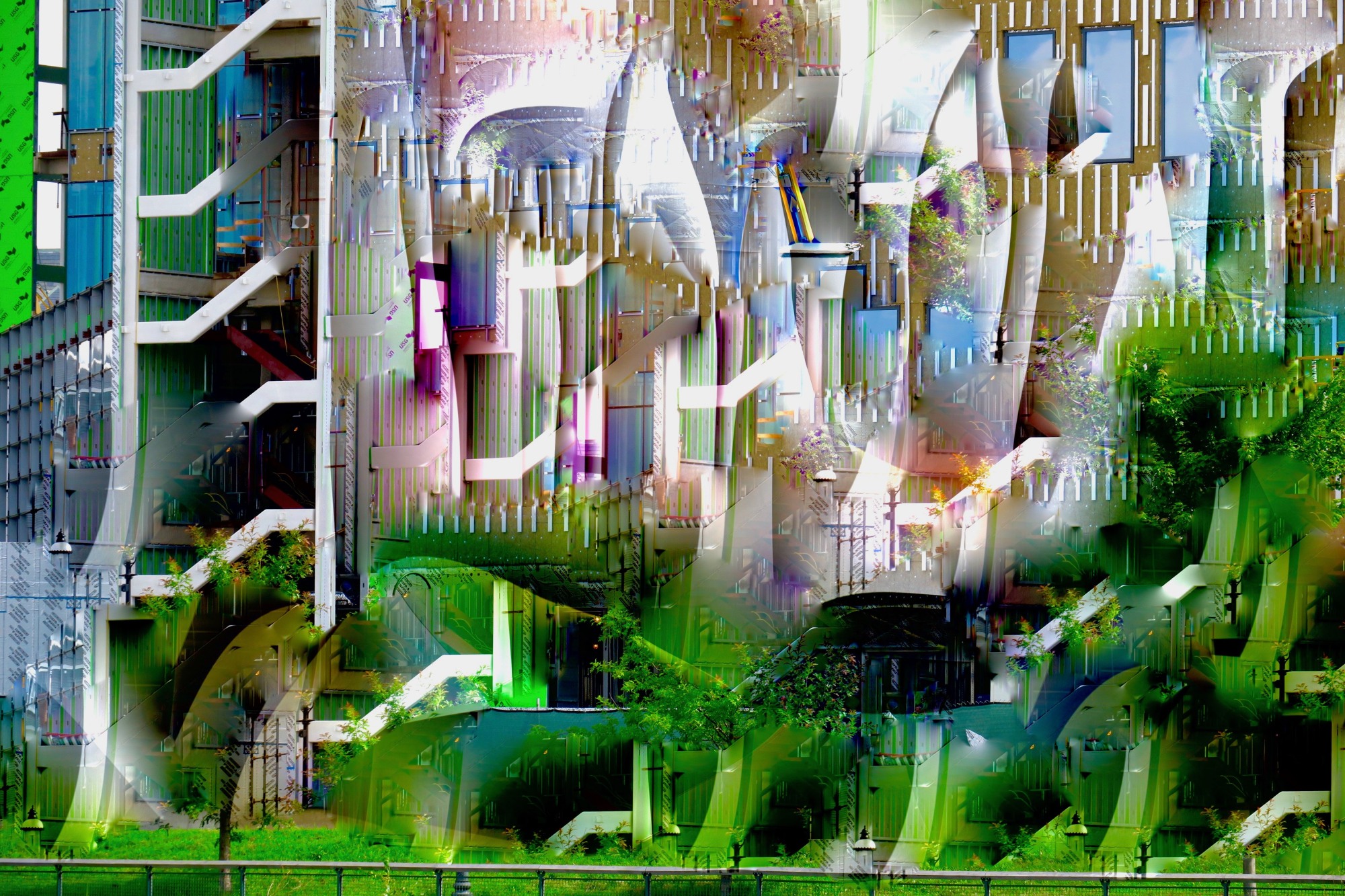 This abstraction from a photograph of a building under construction in Lowell, MA., was created in 2018. I was fascinated by the colors and shapes of the underlayment materials and the concrete forms used in its construction. The patterns are striking as are the subtle color and textures. There is a wonderful play between the realistic elements in the painting and the abstractions.
