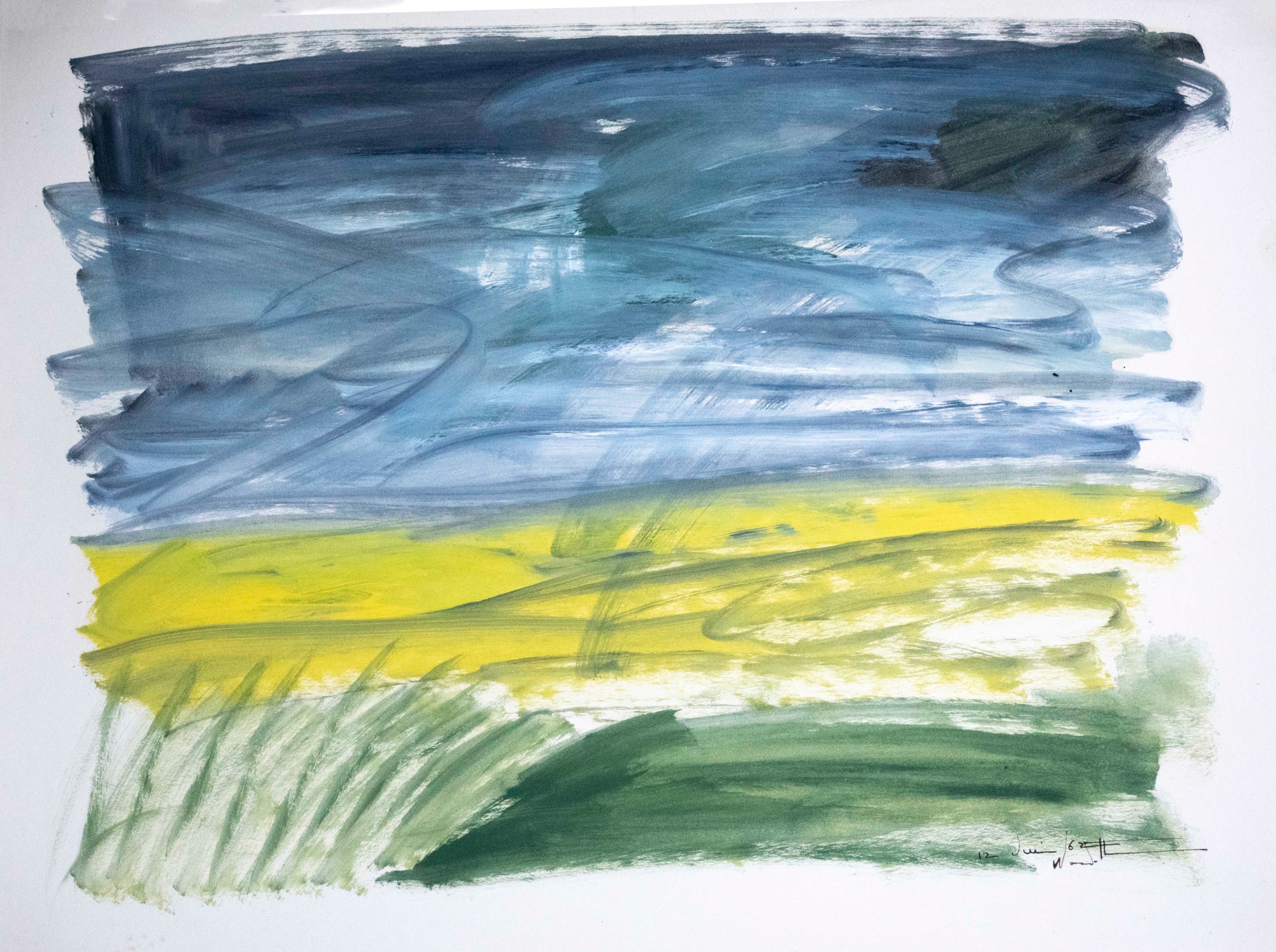 Landscape. Green foreground; green/yellow mid painting and grey/blue sky