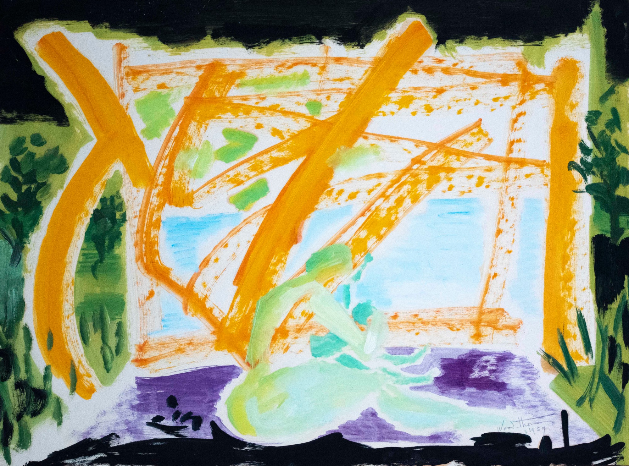 Female in light lime green sitting facing right holding a child in darker green. Sitting on a lavendar surface. At the beach with water in the background. Orange folage behind them with green to the right and left.