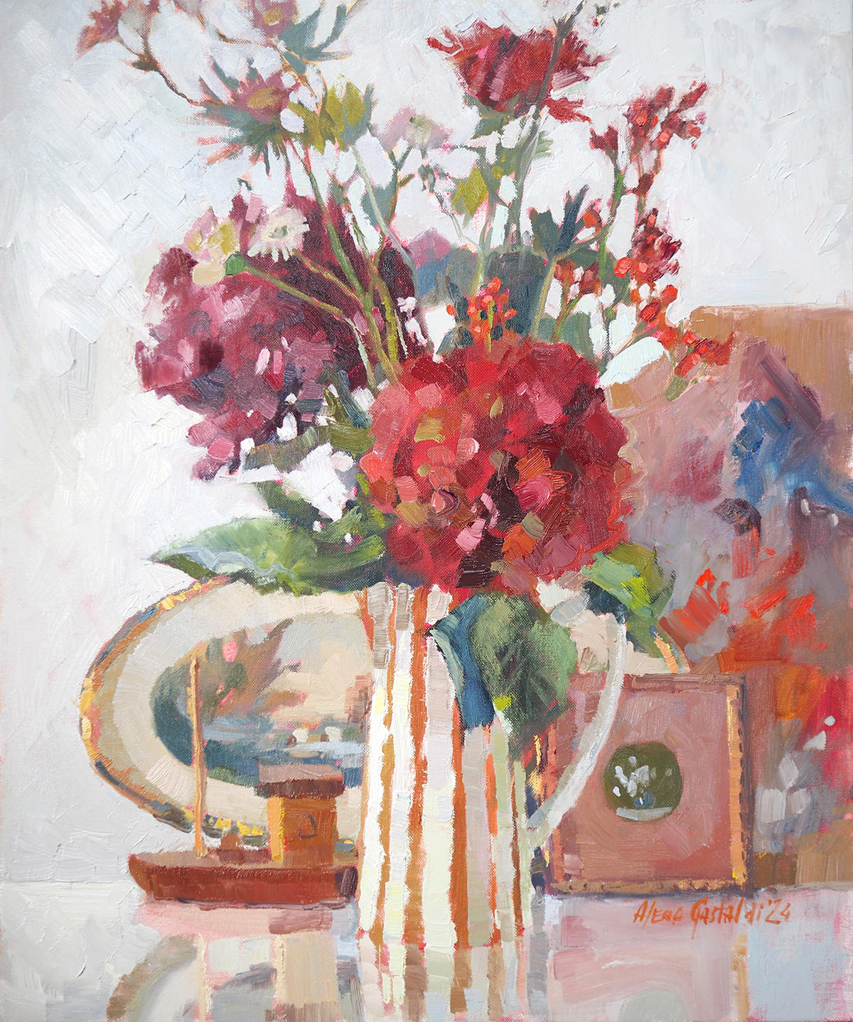 Part of a series exploring the quiet rituals that create a sense of home in unfamiliar surroundings, this painting reflects the artist's weekly routine of visiting a local market after relocating to a new country. The arrangement - seasonal flowers paired with personal objects - becomes a meditation on belonging, grounding, and the small acts that anchor us during transitions.