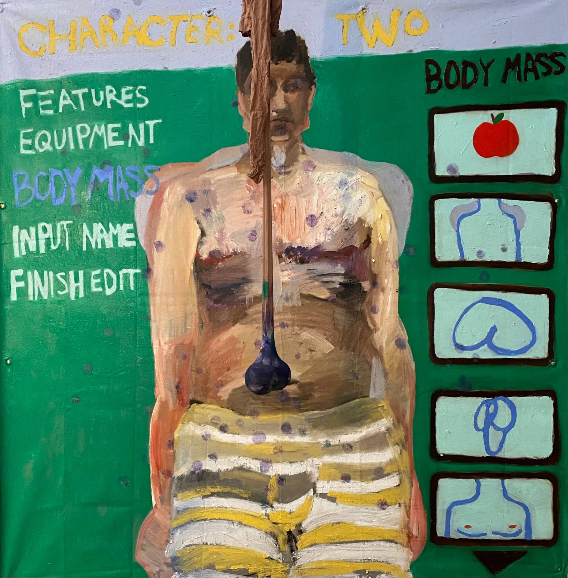 This work highlights the polarizing connectivity between the self and object seen from the mirroring image. The hanging balls were used to play a game of catch and throw against the painting to create deep points of pressure.