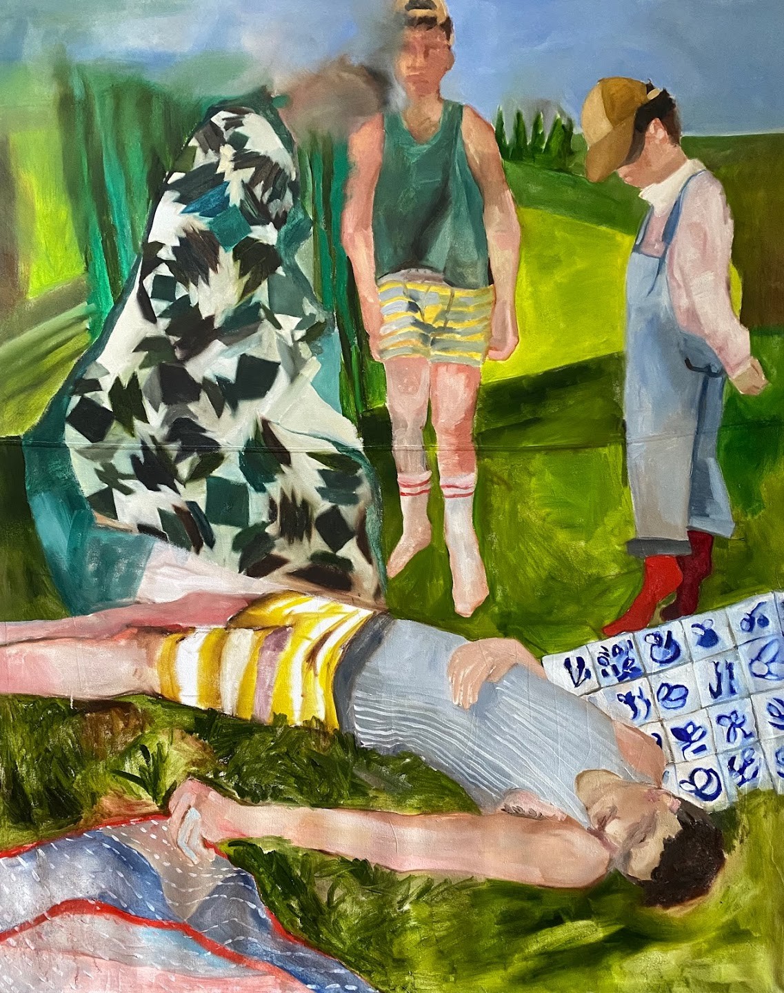 A death of a soldier fighting many battles. The father, son and holy spirit look over what they have created. I am also the father. I am also a son. I am also the holy spirit. I am a boy. I am like Hockney's lover looking over the pool of life. Either floating or grounded, that is for you to decipher. This a landscape but also a narrative. It is a religious scene but I am wearing my clothes and my once favorite underwear in an alternate body. Is that body standing next to it’s counterpart or resting on my restlessness?