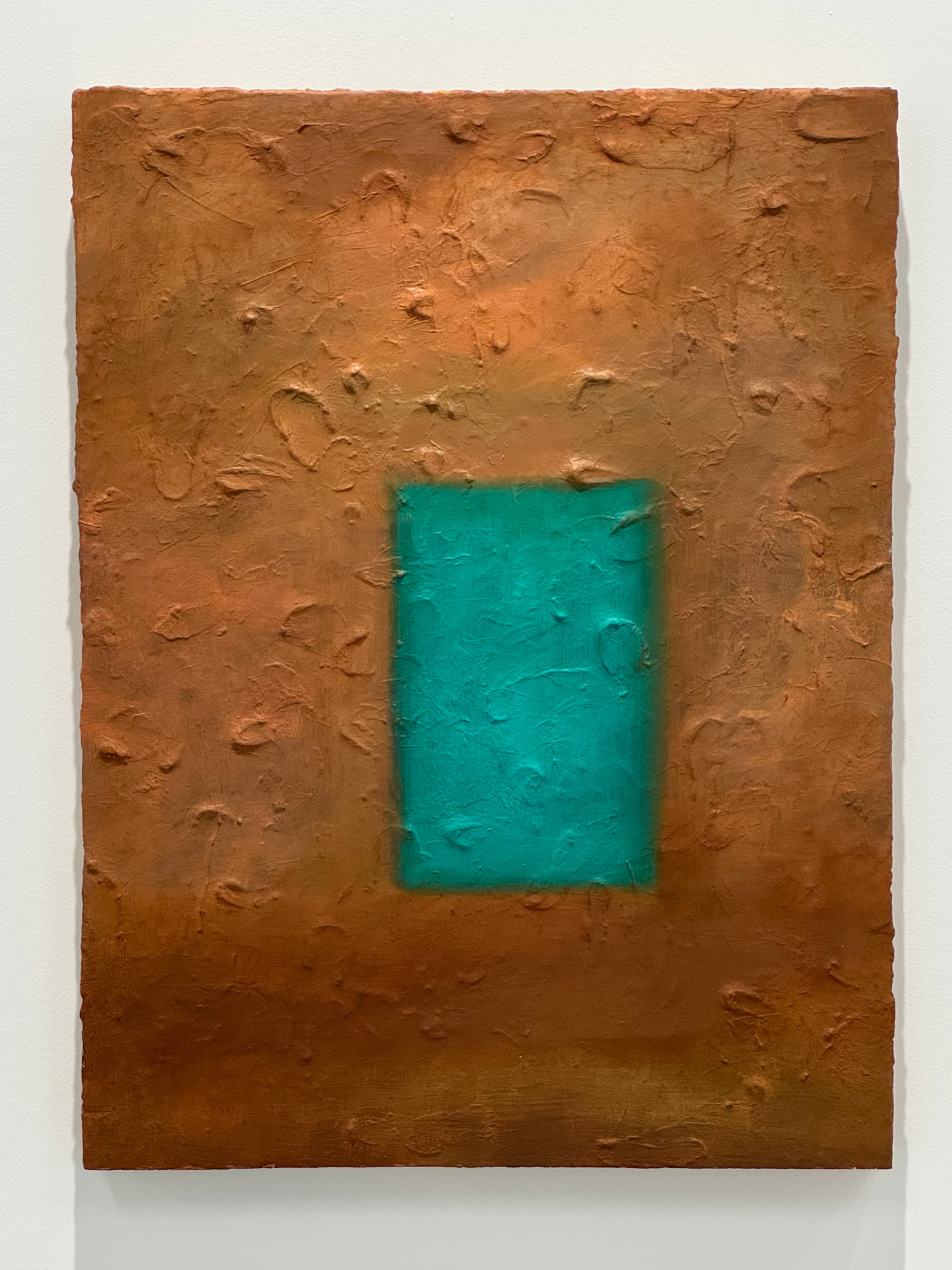 At the heart of the artwork, a bold rectangle of vibrant turquoise emerges, creating a focal point that draws the viewer’s eye. This central element contrasts starkly yet harmoniously against the earthy backdrop, symbolizing a fresh burst of energy amid the serene and grounded tones. The subtle variations in the background add depth and complexity, inviting an exploration of the details embedded within the textured surface.