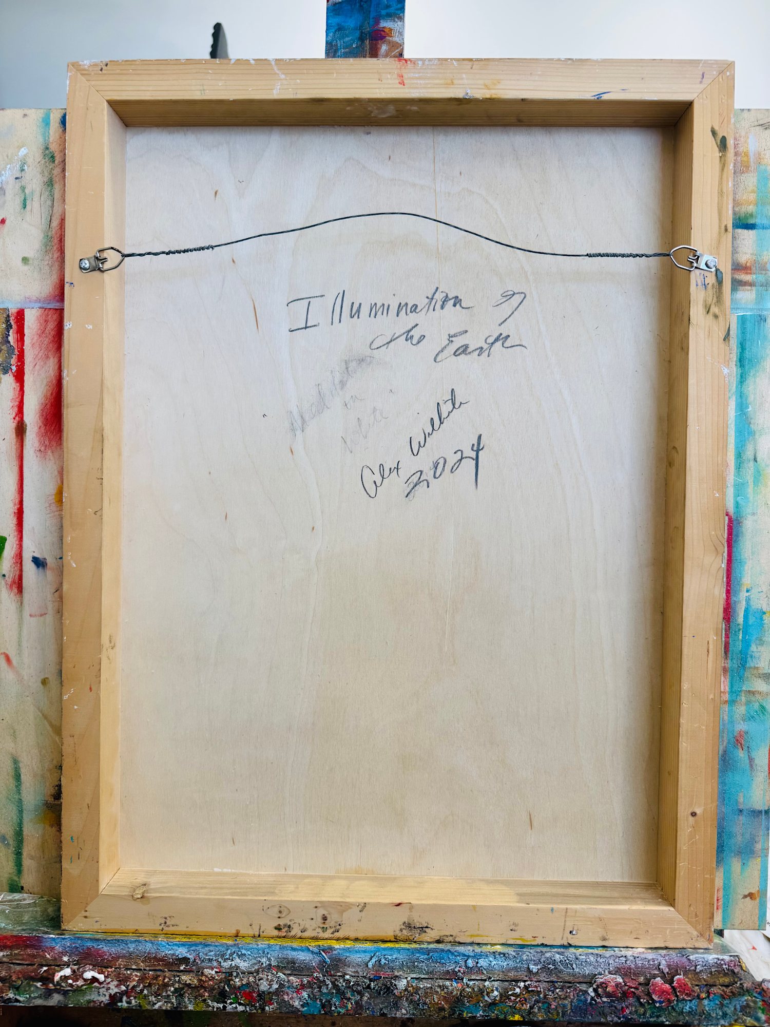 "Illumination of the Earth" is an engaging exploration of texture and color, presenting a dynamic interplay between earthy tones and vibrant highlights. Measuring 24 by 18 by 1.5 inches, this captivating piece is crafted with oil and cold wax on a cradled board, offering a tactile and immersive experience. The foundation of the composition is a rich, earthy brown, forming a textured surface that evokes the natural patterns and organic forms found in landscapes.