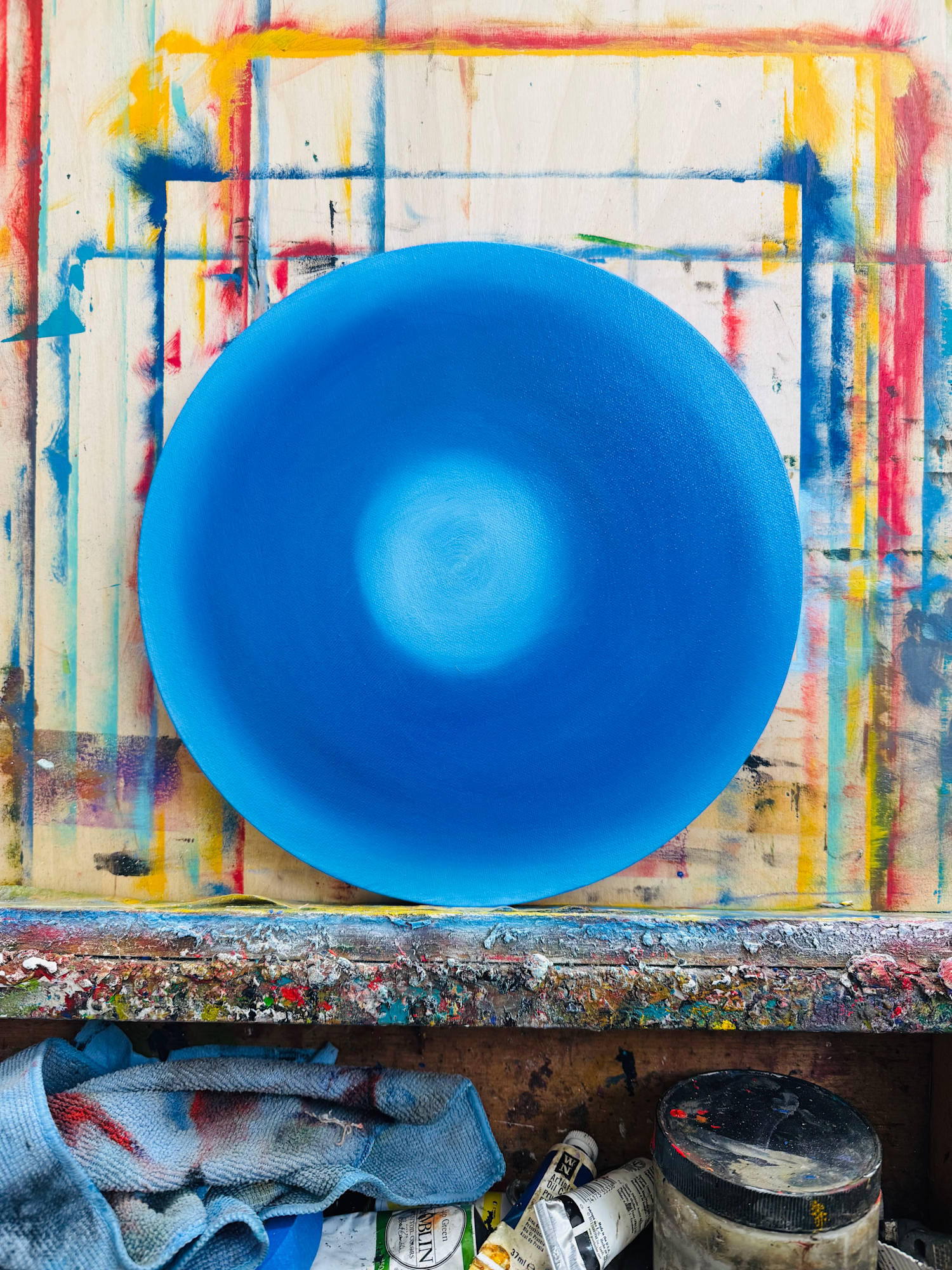 I'm delighted to introduce you to my latest creation, "Infinite Edge of Calm." This 12 x 12 oil on tondo canvas piece explores the serene beauty of a circular form with a vibrant gradient of blue hues. The artwork features a gentle transition from a deep blue at the outer edge to a light, almost ethereal center, offering a tranquil and focused viewing experience. Inspired by the work of James Terrell, the creation of this piece was a unique journey into blending smooth shades to evoke a deep sense of calm. I look forward to hearing your thoughts on "Infinite Edge of Calm" and hope it brings a moment of peace and reflection to your day.