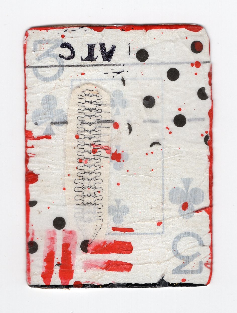 Front: Human spine layered over with a sewing pattern and red ink to mimic blood spatter. Red and black borders allude to covert geographic information to find a safe abortion provider. ATC stamp added by a now forgotten teenaged Goth Kid with a sense of gallows humor.