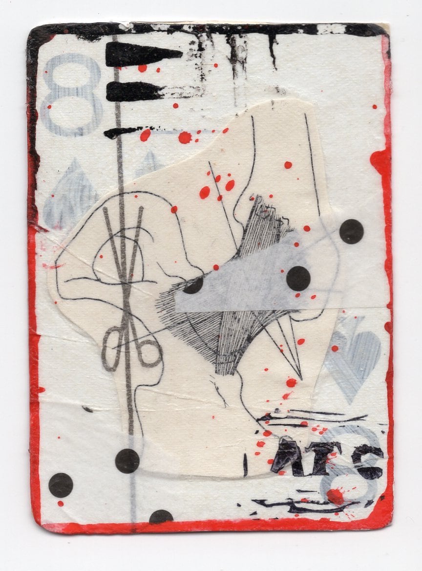 Front: Human hip bone overlayed with an old dress pattern and red ink to mimic blood spatter. Red and black borders, lines and dots allude to geographic information pointing people to a safe abortion provider in a now unknown place.