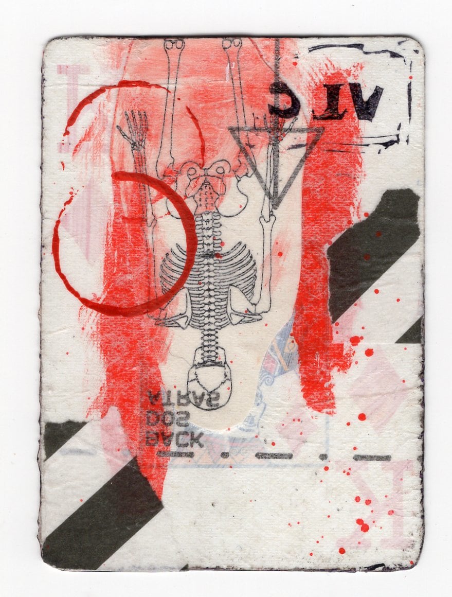Front: Human skeleton overlayed with old sewing pattern. Black borders and lines allude to geographic information pointing people to a safe abortion provider in a now unknown place. Red circles imply secret identities about the people who made and shared the deck.