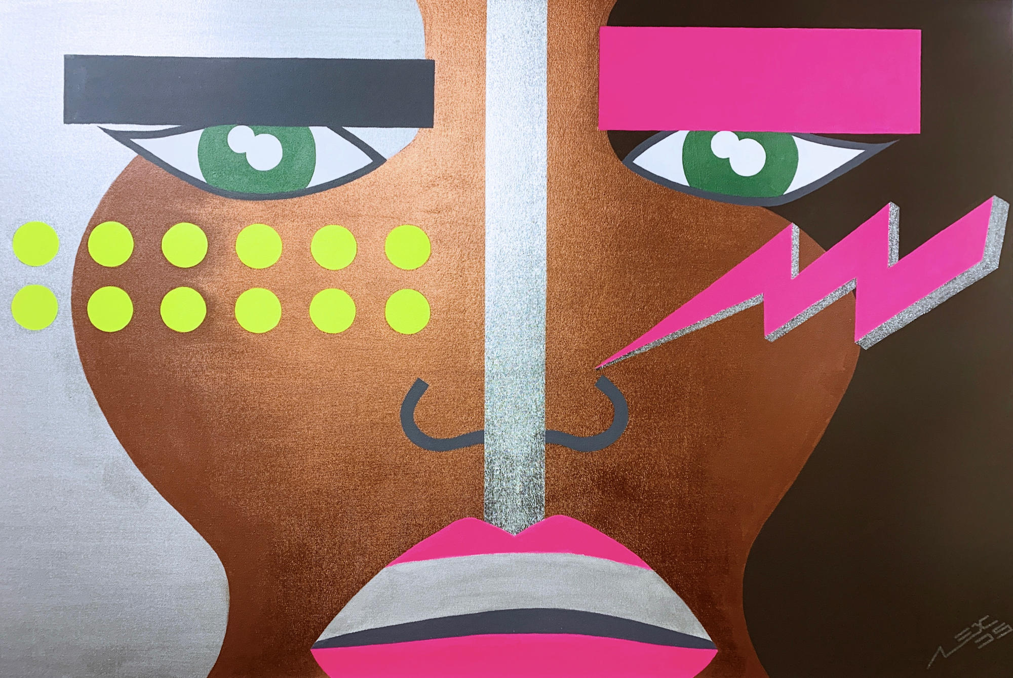 Fictionary painting audio and visually inspired to the great club music of the '90s, featuring special metallics and neon colours. Special wide landscape format. A unique piece which will transform your home with its positive vibes and bright colours.