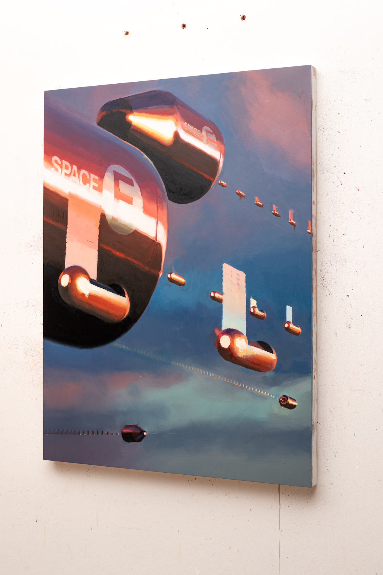 MessageThis painting addresses the questionable competition between world powers to colonize the atmosphere with satellites. Two spaceships float in the sky and spew out their contents. Almost like garbage trucks that don't collect their contents, but spit them out. After polluting the earth on the ground, we are now beginning to spread our space technology in the sky as well.