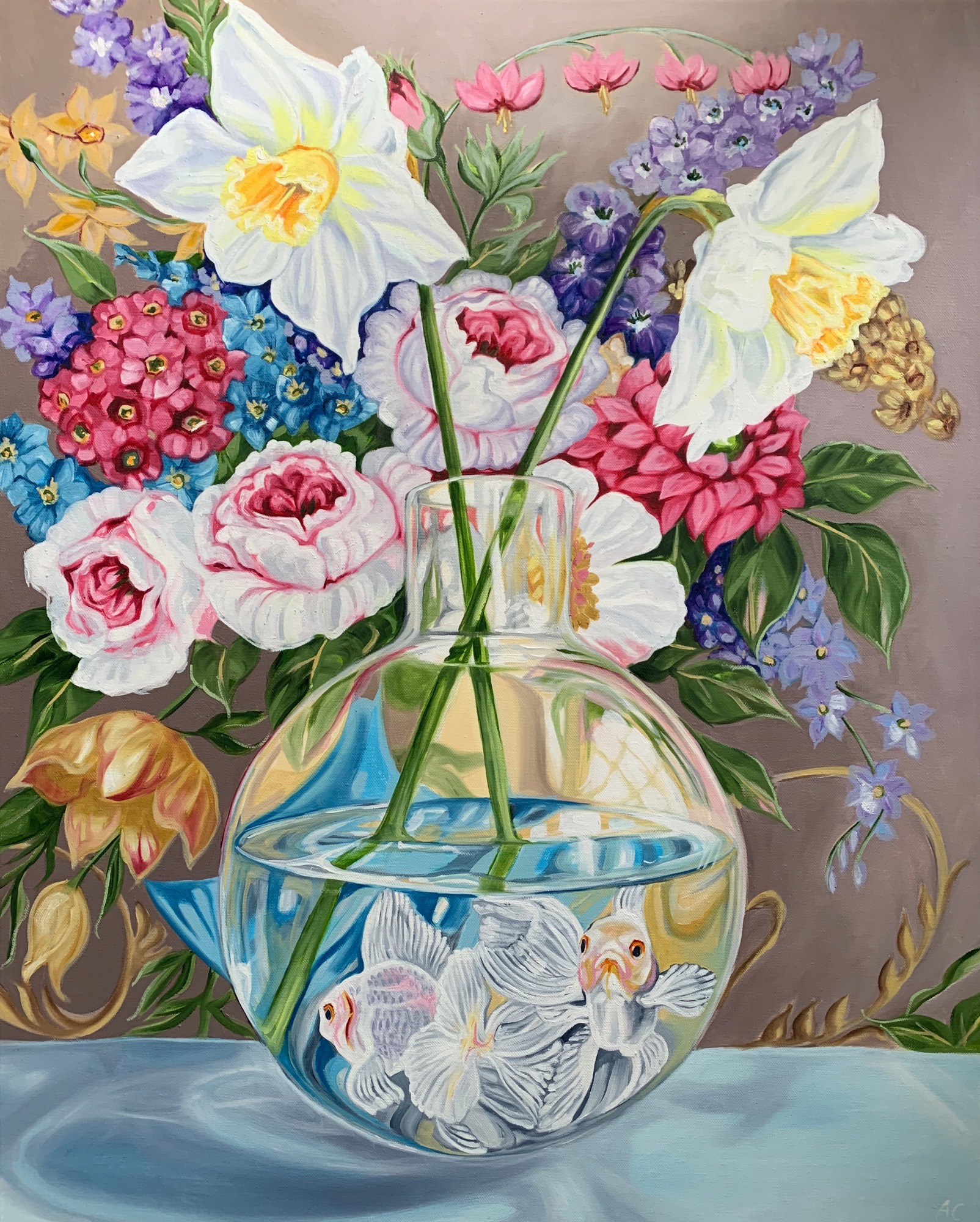 This period of time has involved a lot of introspection personally and as the seasons turned into Spring I have felt a new flourish to life and what it holds. This painting for me is a symbol of that growth, floating fish and dissociation tapping at the glass, flowers bursting forth to light, colour and freedom within one's self if you dare do the work and look for it...
