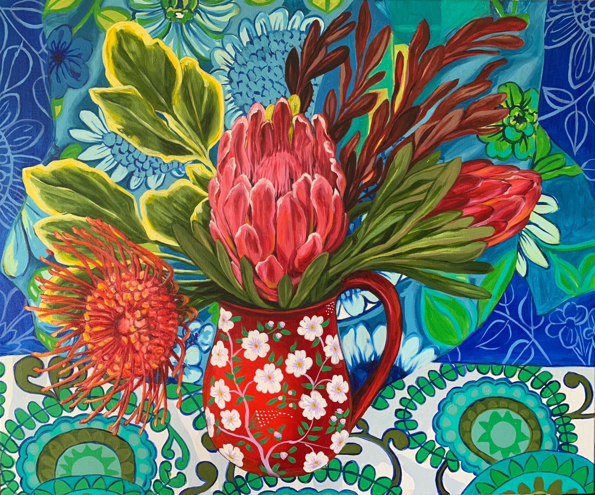 I've been collecting Vintage and Antique fabrics for over 20 years and have always been inspired by the bright colours and patterns they present. This painting shows two of my most favourite 1970's Barkcloth fabrics, the clash of blues in these really pop! A bright enamel vase holds a selection of nearby gardens delights, I chose the more angular botanics to mimic the design and complimentary colours of the fabrics.