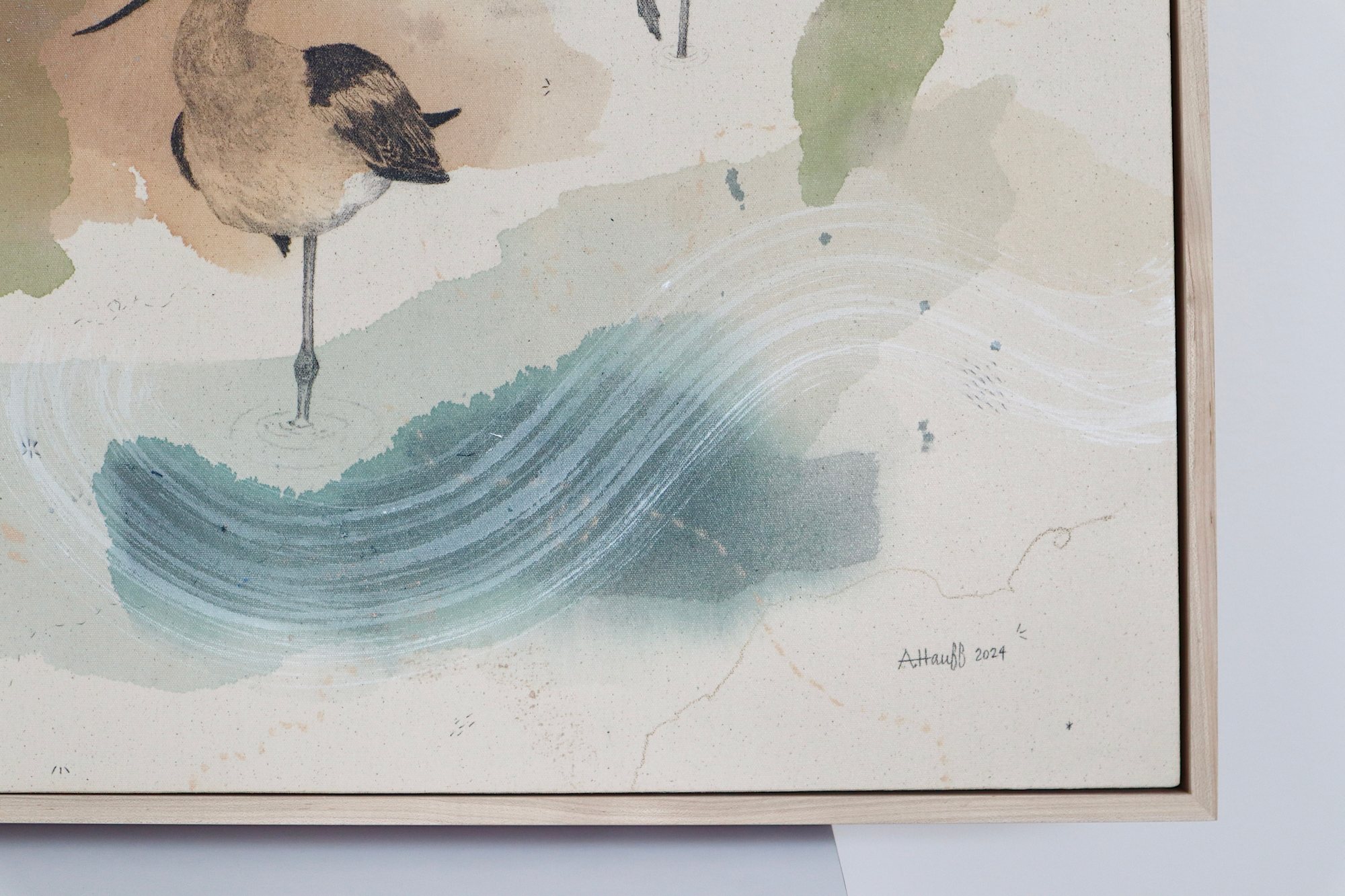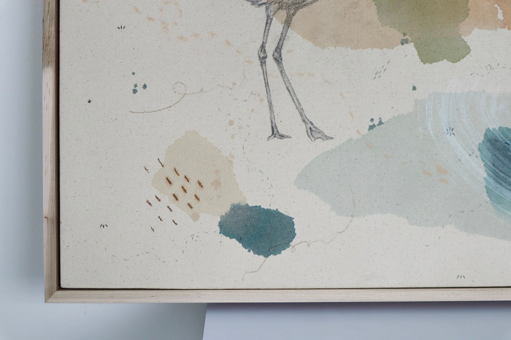 Original mixed media on raw stretched canvas with maple float frame. Alternate hardwood frame available upon request.