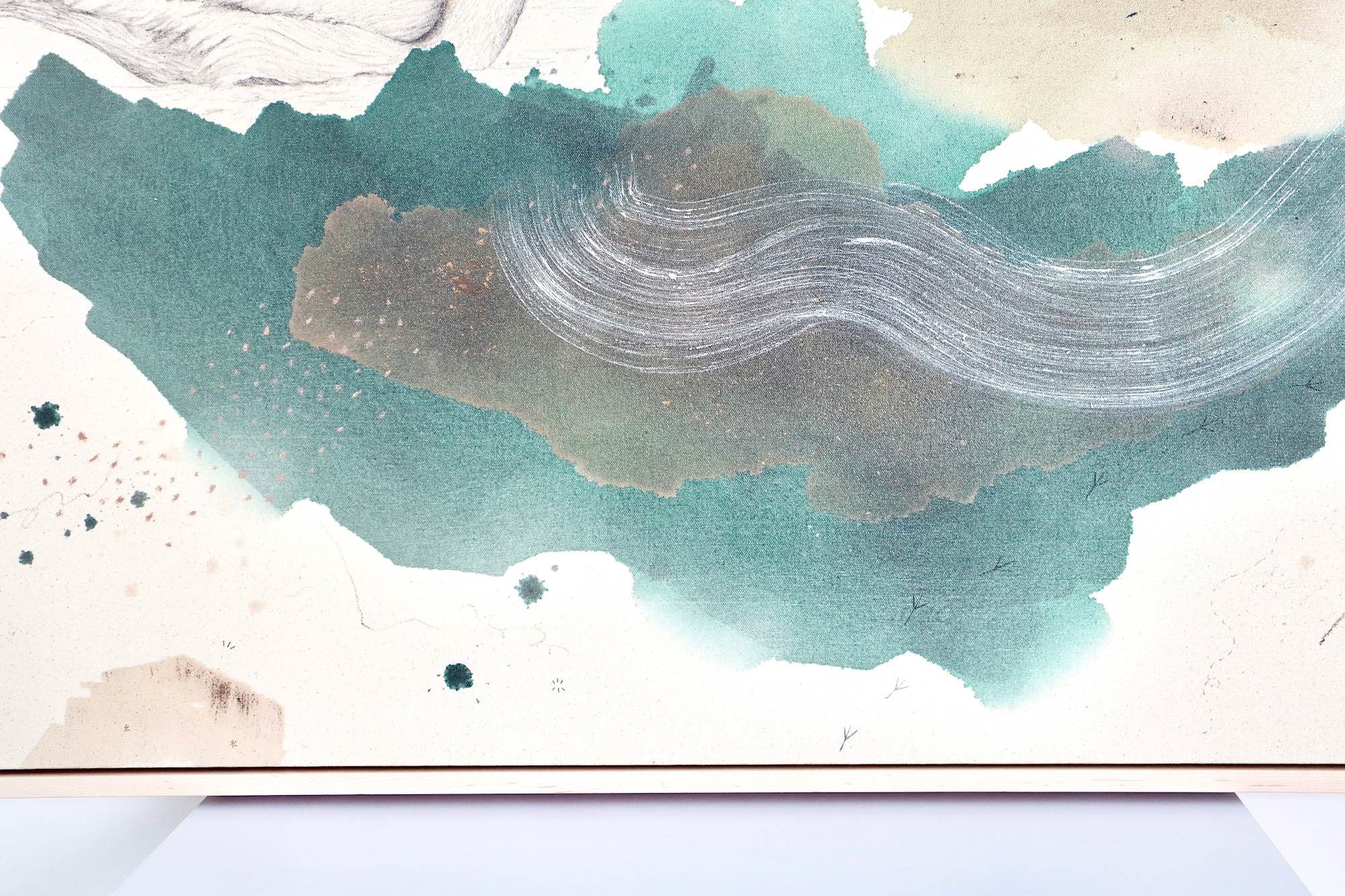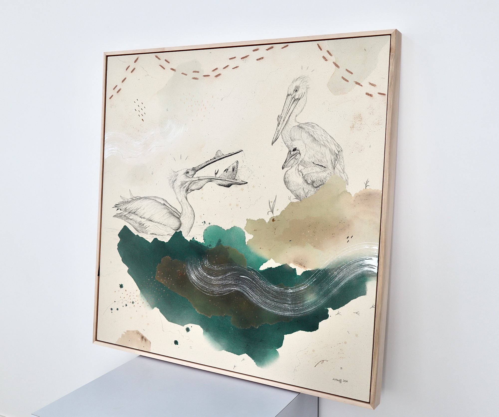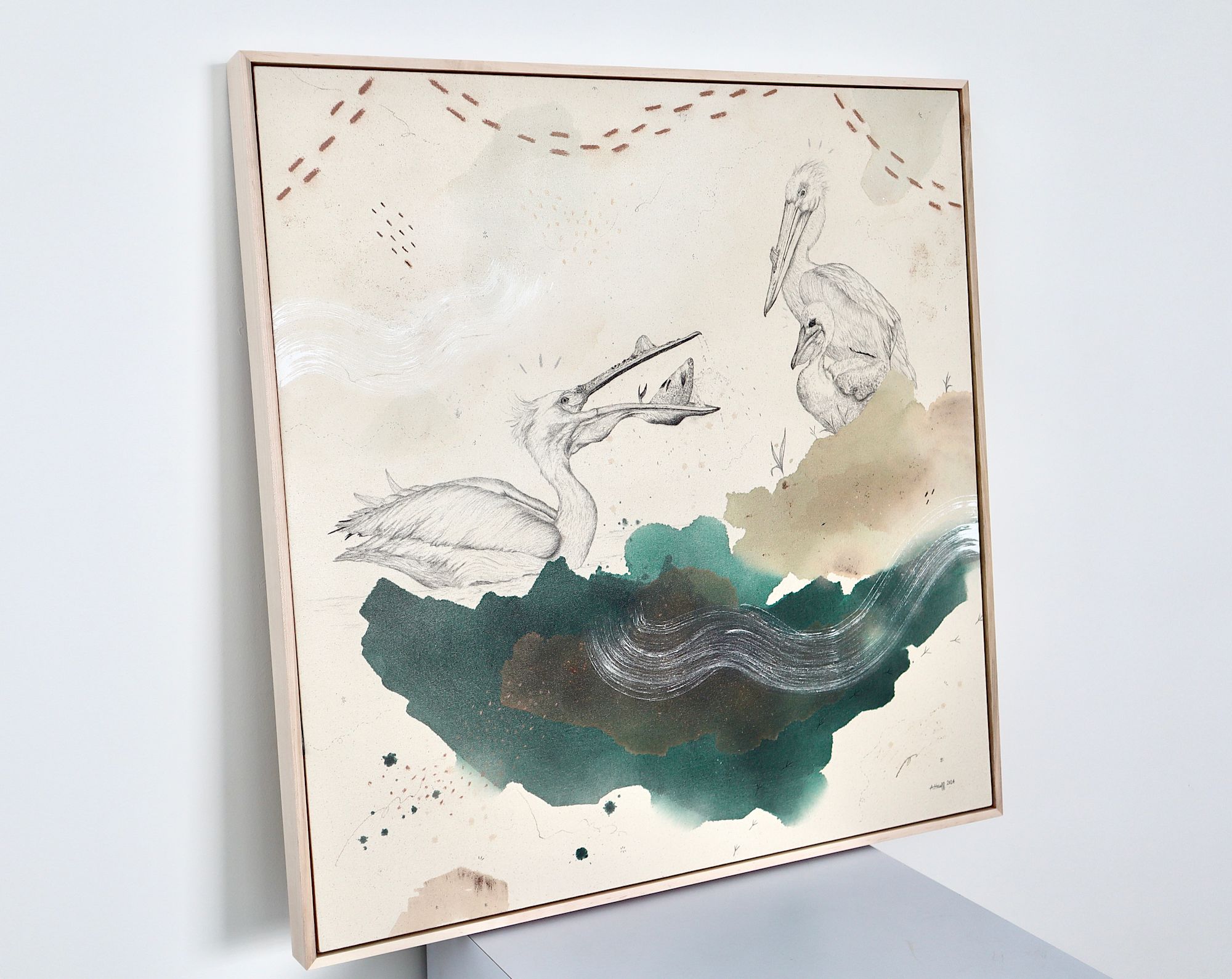 Original mixed media on raw stretched canvas with maple float frame. Alternative hardwood frames available upon request.