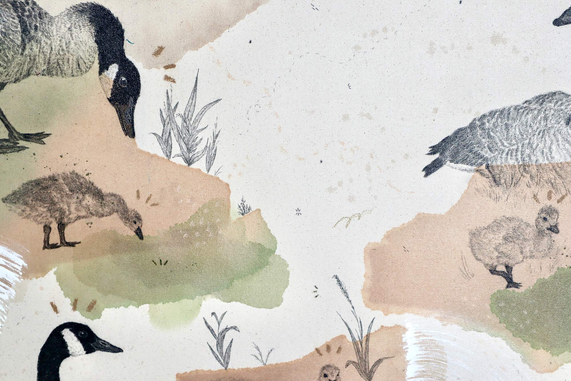 These geese mate “assortively,” choosing mates based on similar size. Pairs mate for life, and remain together throughout the year with their young, flocking with other families. They nest in colonies, and even after fighting over territories, often still nest close to each other depending on habitat. They’re also known to defend readily. Canada Goose threat displays may involve head pumping, bill opened with tongue raised, hissing, honking, and vibrating neck feathers. When an intruding goose doesn’t retreat, geese may grab each other by breast or throat and hit each other with their wings. It’s best to not approach them head-on, seen as threatening, but keep a distance at an angle, waiting for them to pass—and they do!