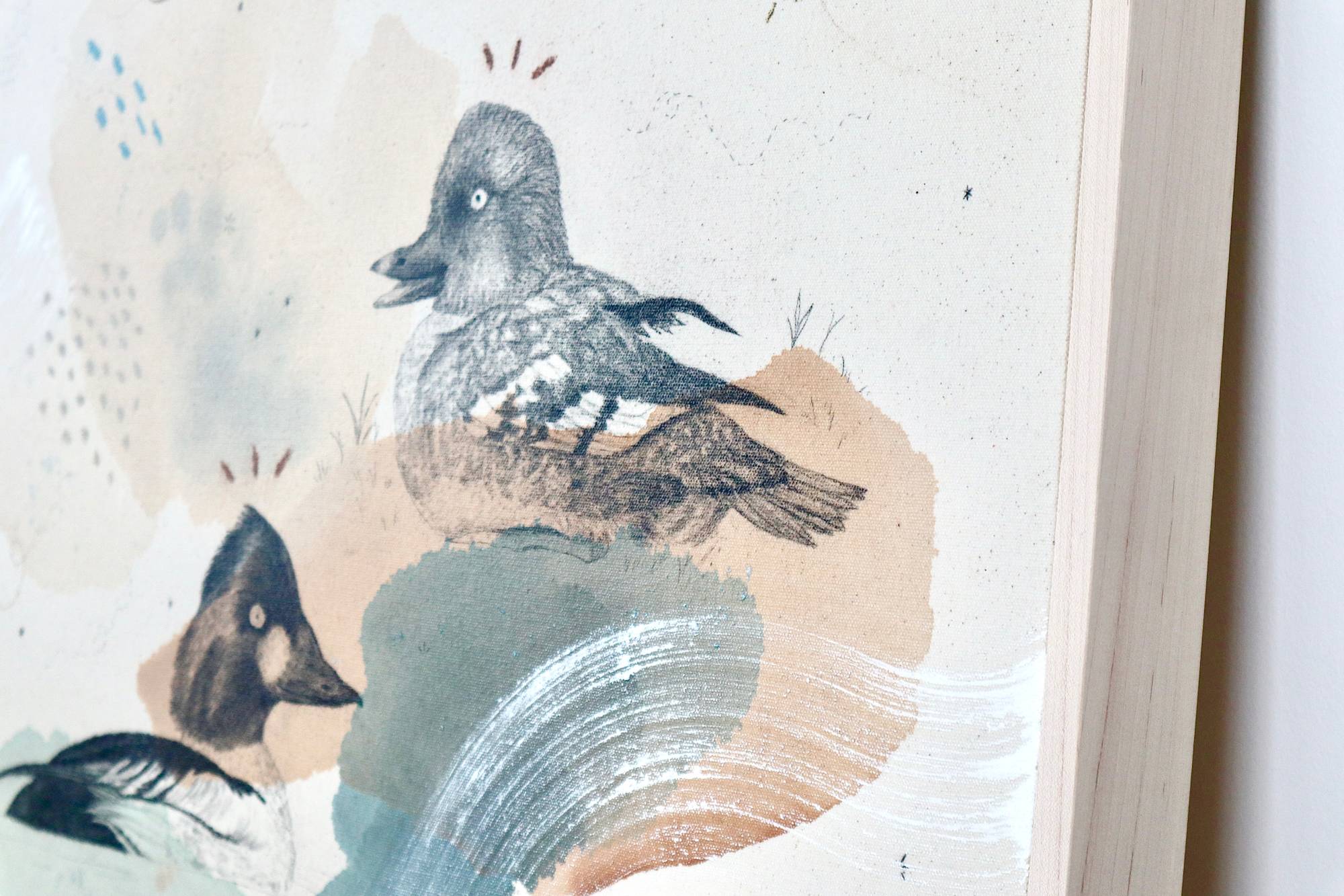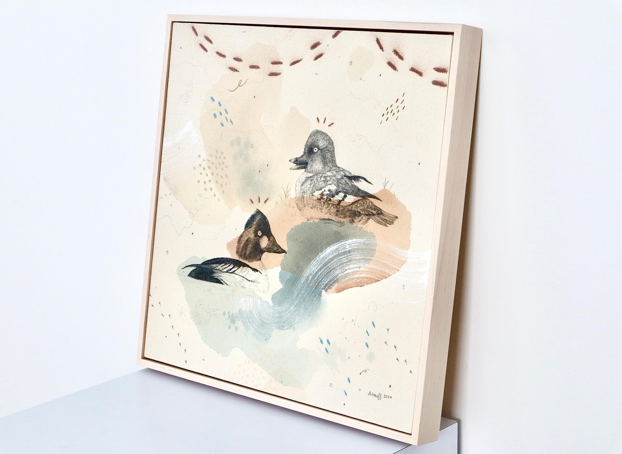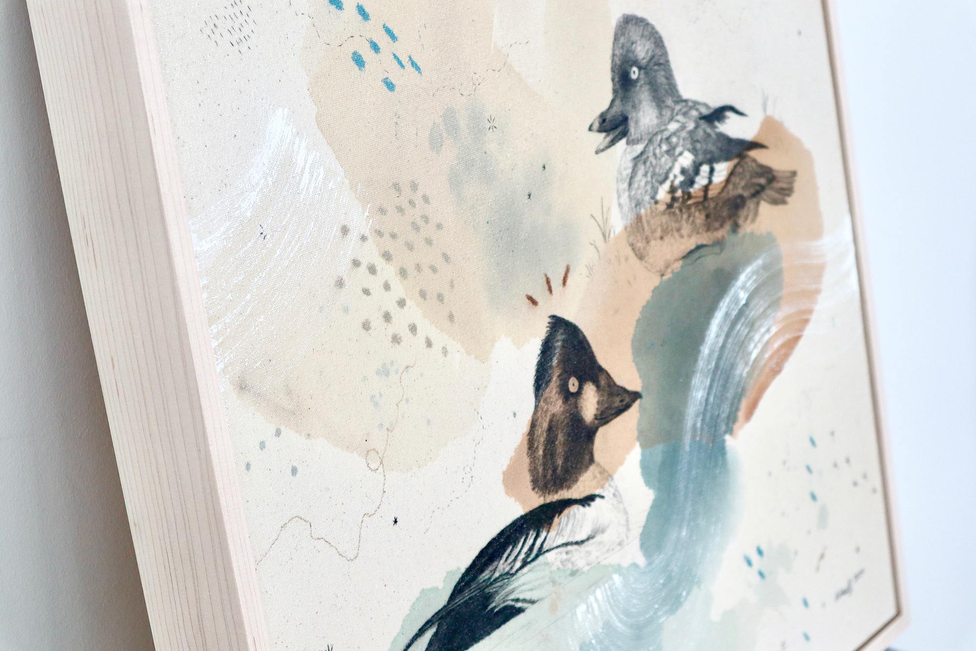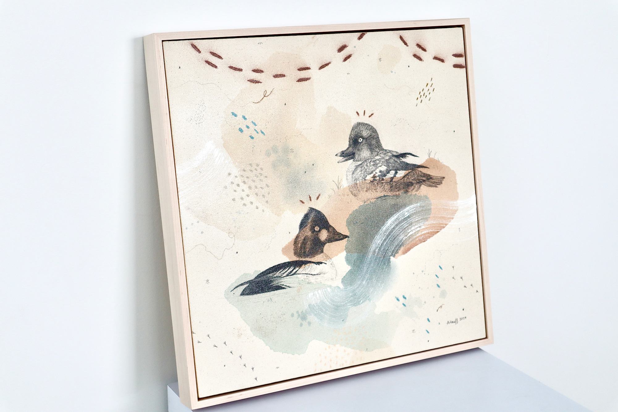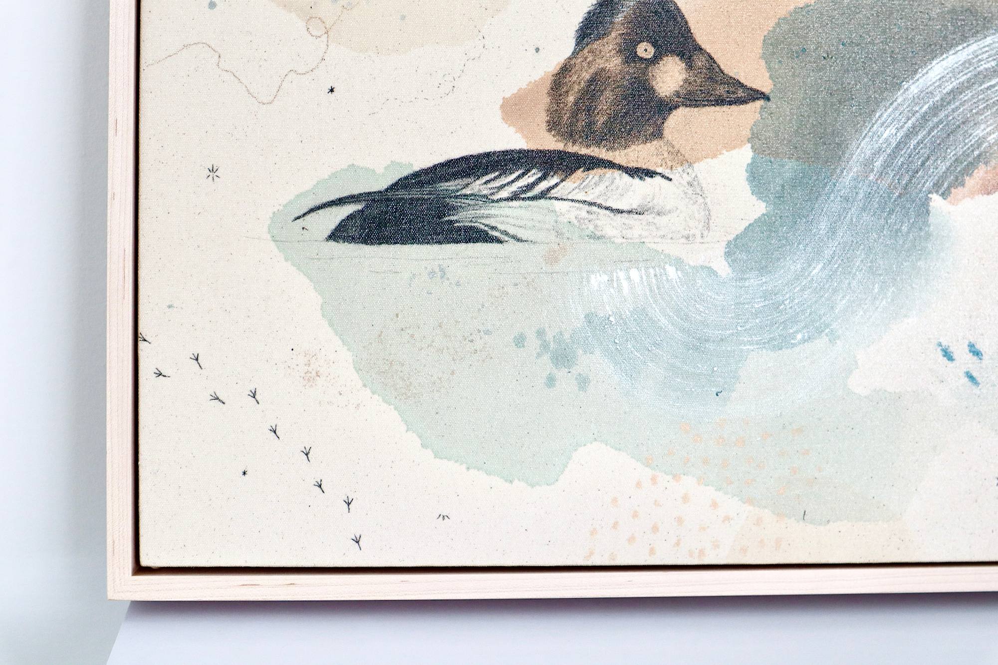 Original mixed media on raw stretched canvas with maple float frame. Alternative hardwood frames available upon request.