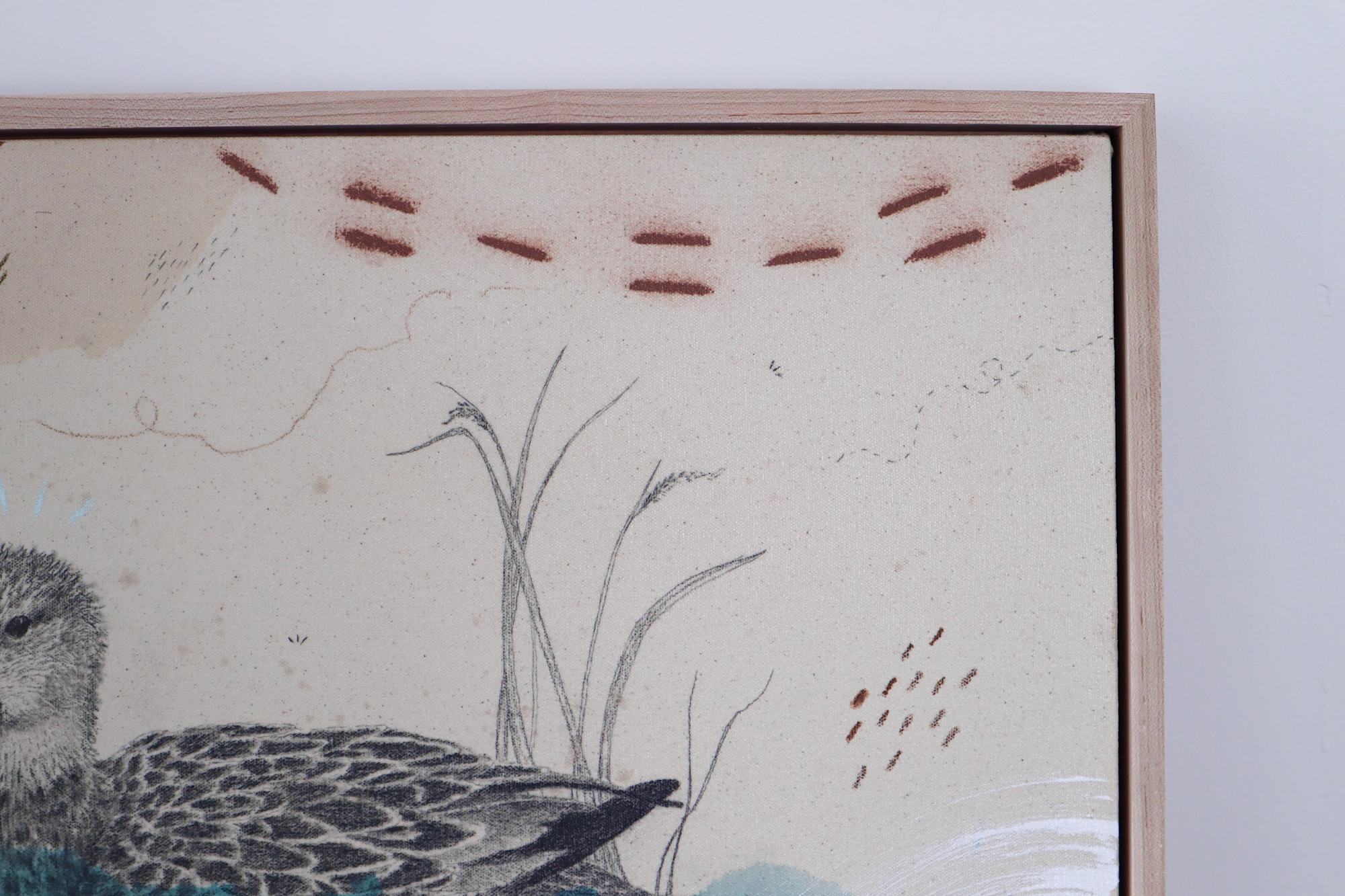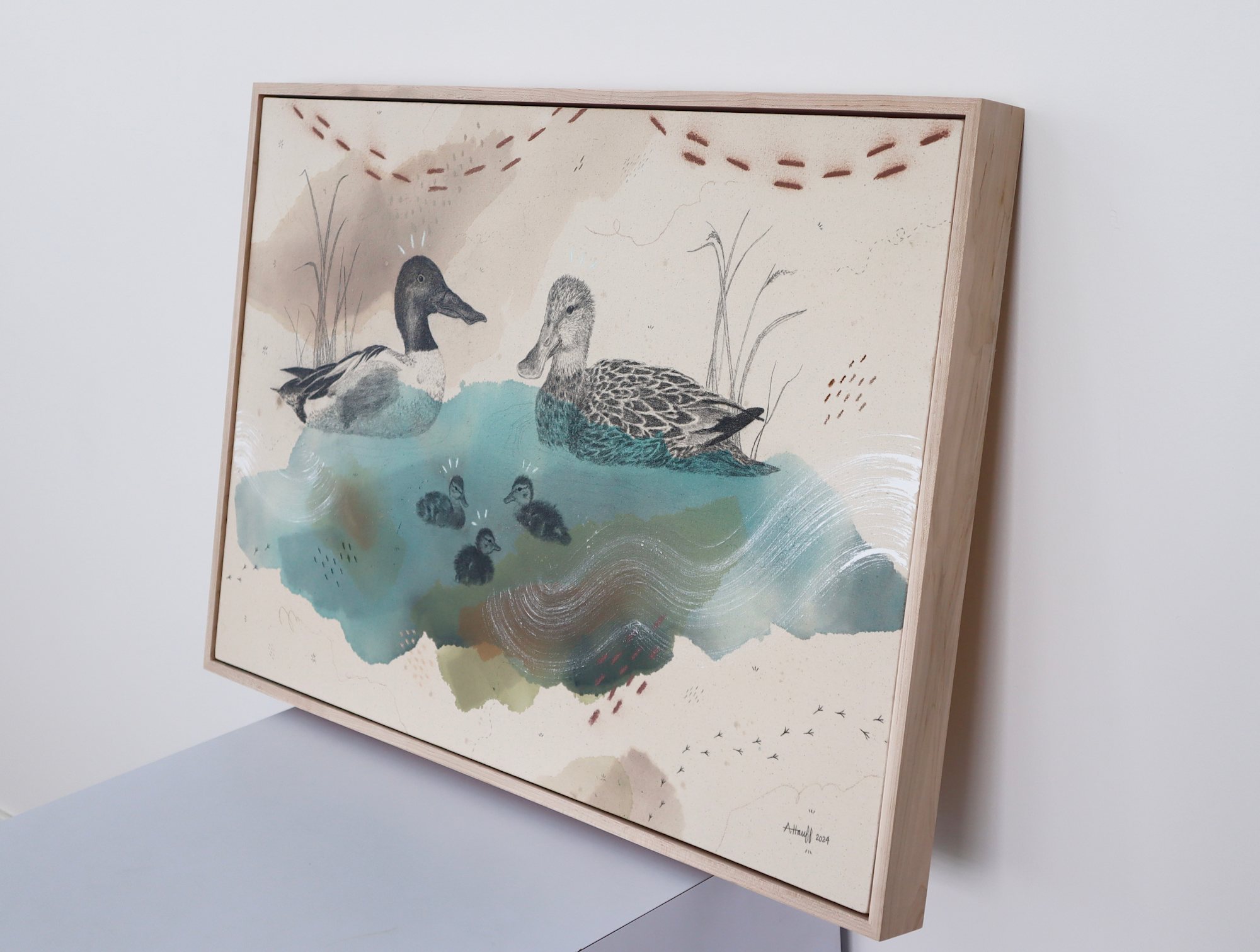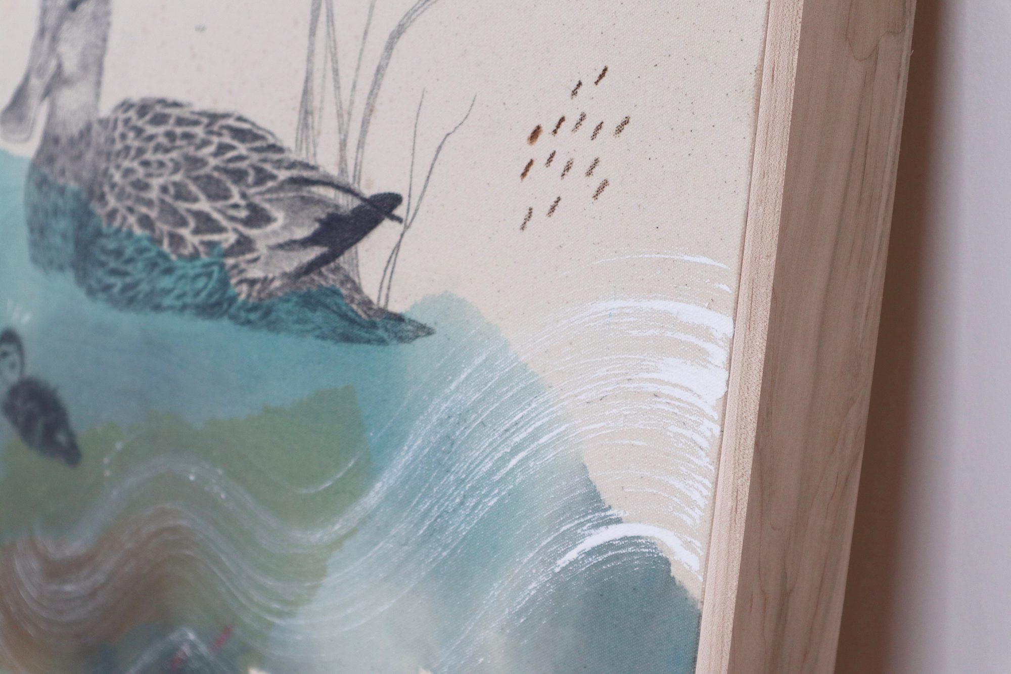 Original mixed media on raw stretched canvas with maple float frame. Alternative hardwood frames available upon request.