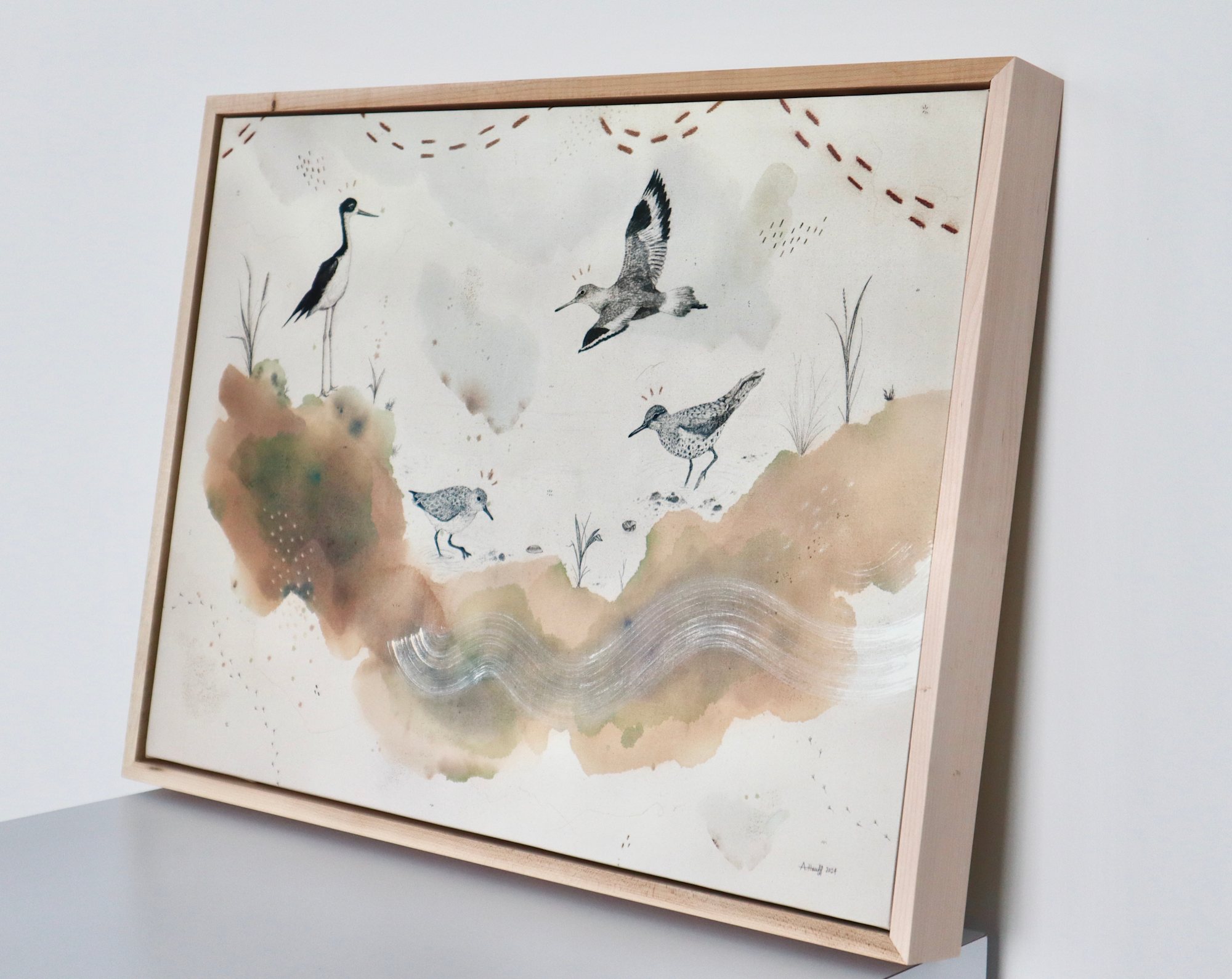 Though appearing dainty, this shorebird does well in a variety of habitats, natural or artificial. They inhabit shallow wetlands with little vegetation. When not nesting or preening, they wade in shallow waters in search of aquatic invertebrates, crustaceans, insects, snails, and tiny fish. They nest on the ground just above water, and both build the nest. Both sexes participate in incubation and chick-rearing, though males appear to accompany older chicks more often than females. The pair bond is maintained through nesting and chick rearing, but if a nest fails, stilts sometimes begin again with a different mate. Stilts nest in loose colonies and are considered semicolonial, defending individual territories (and guarding mates) but joining with other nesting stilts to drive out threats.