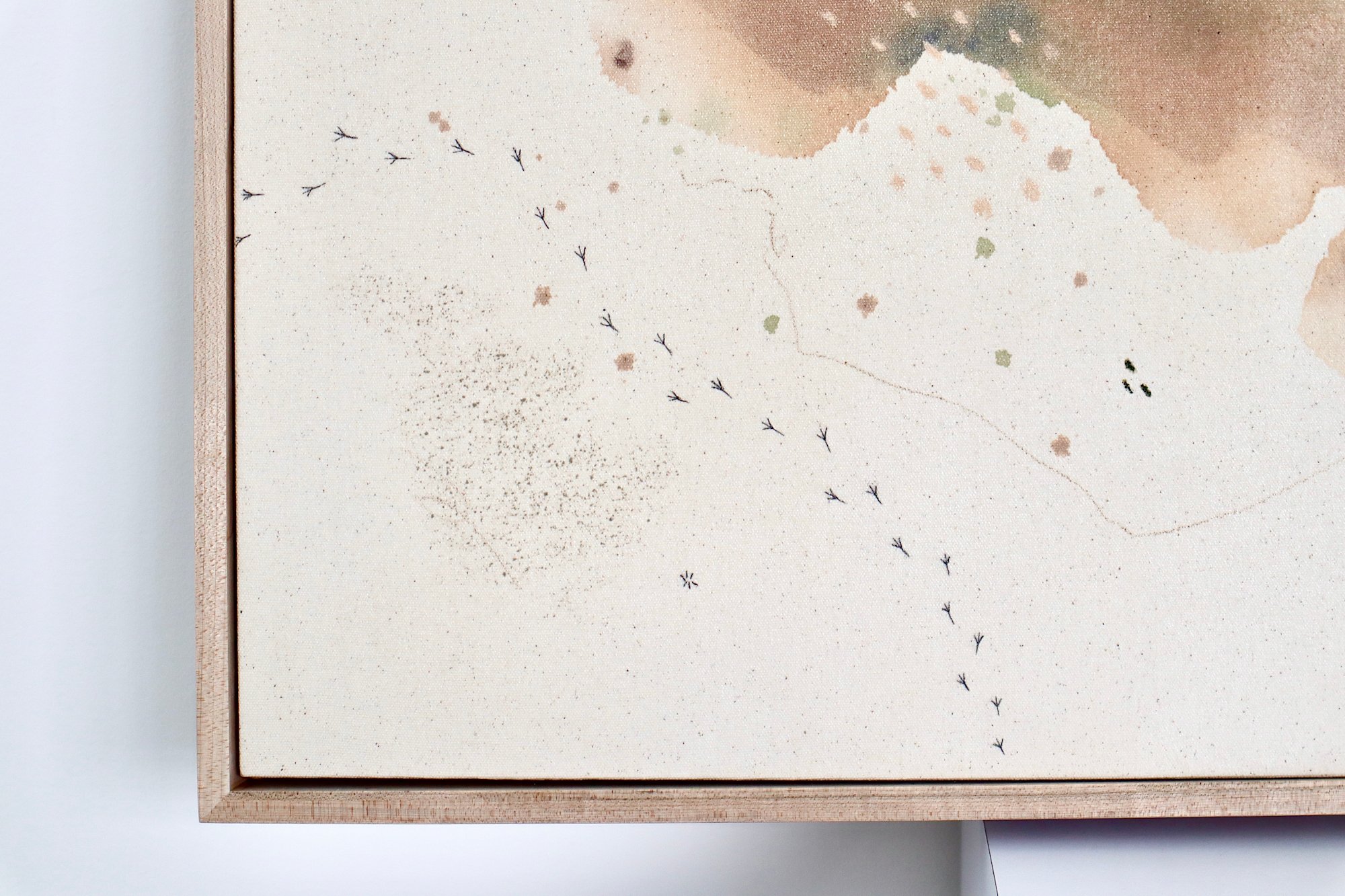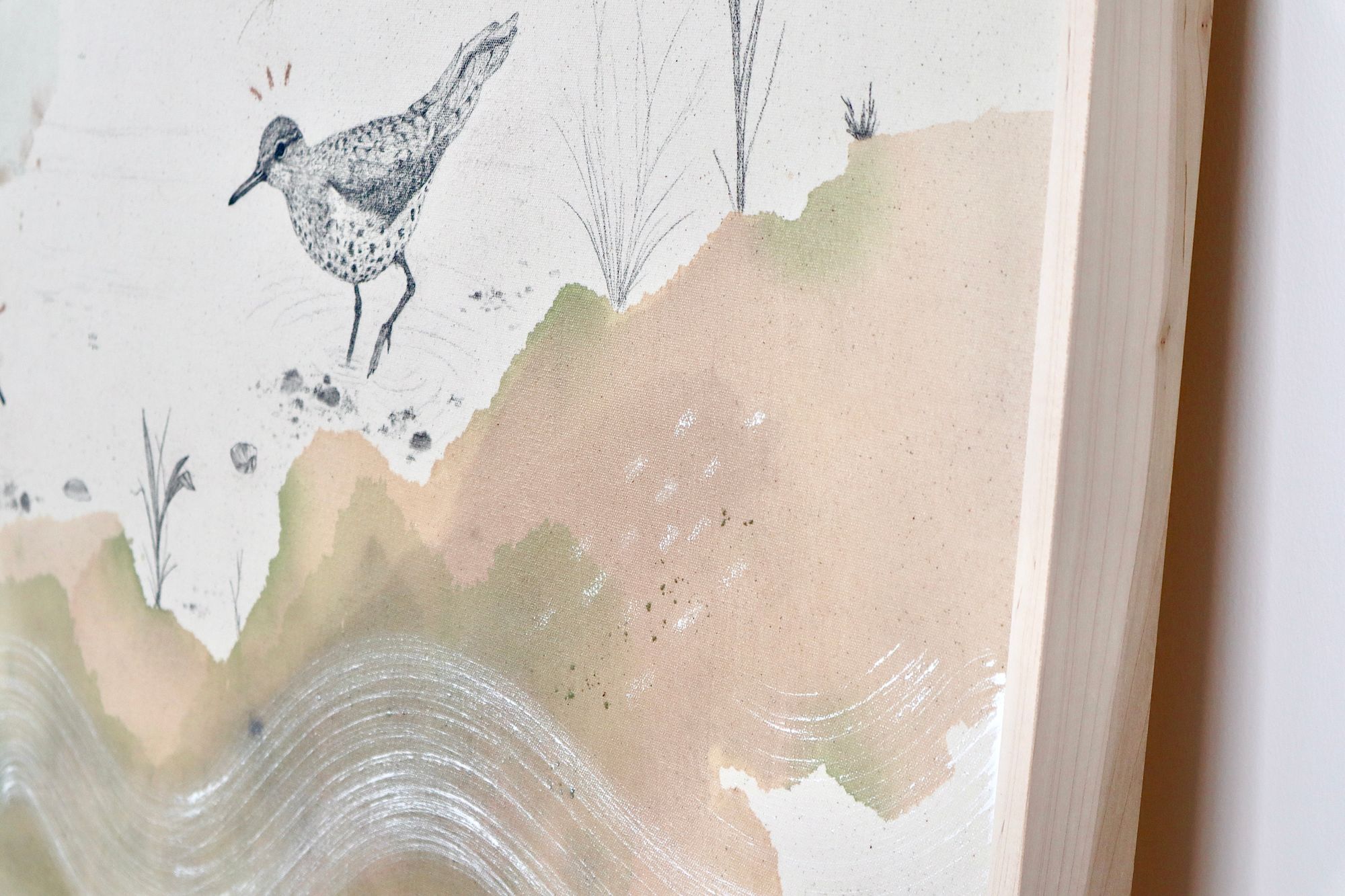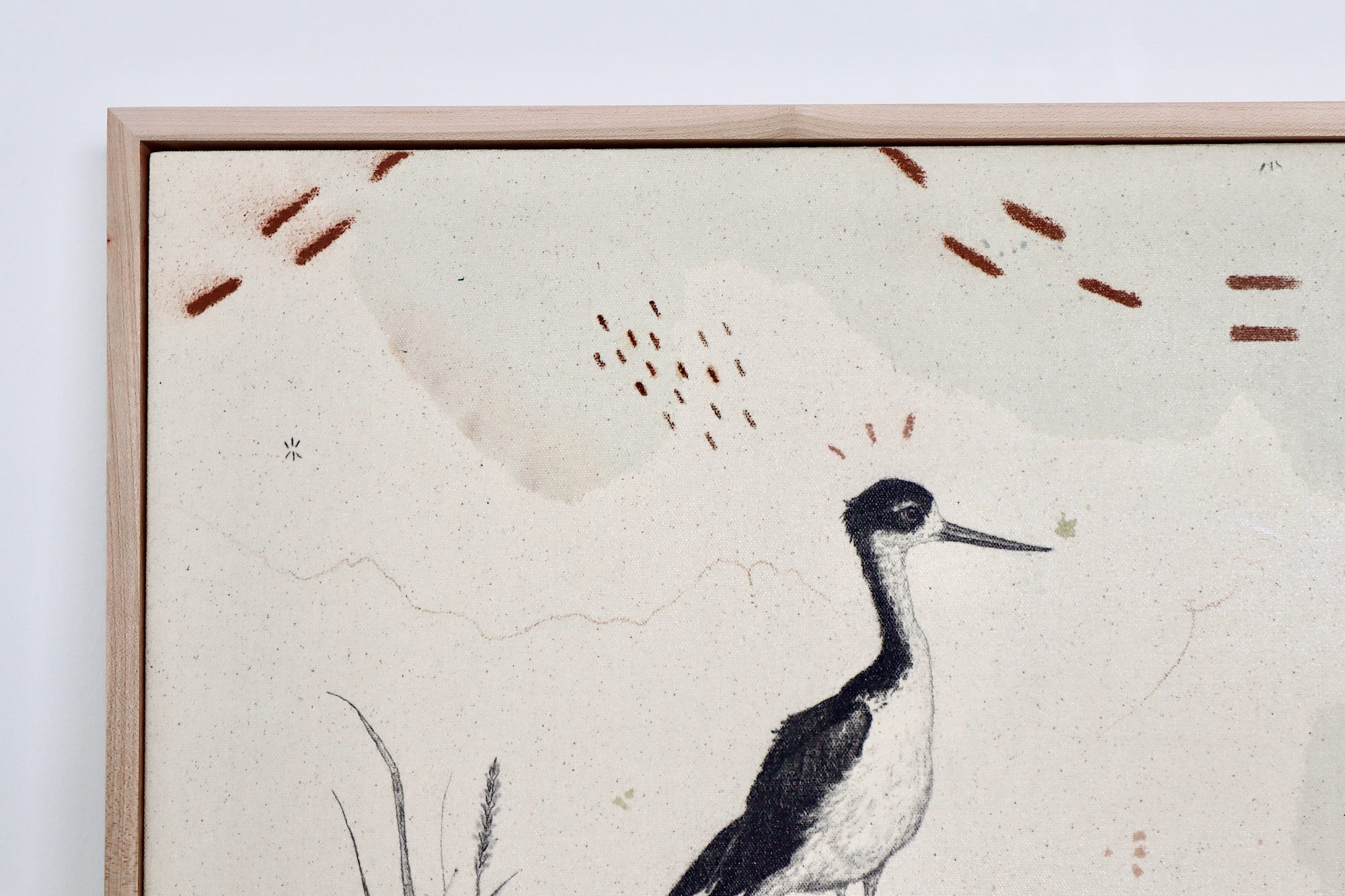 Original mixed media on raw stretched canvas with maple float frame. Alternative hardwood frames available upon request.