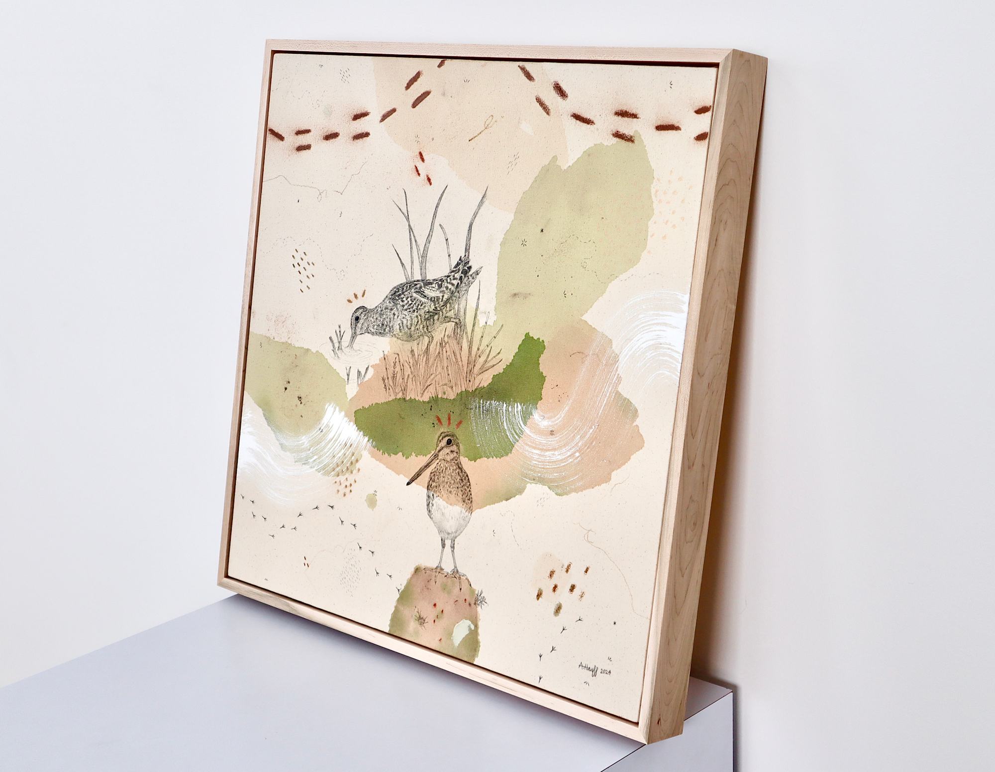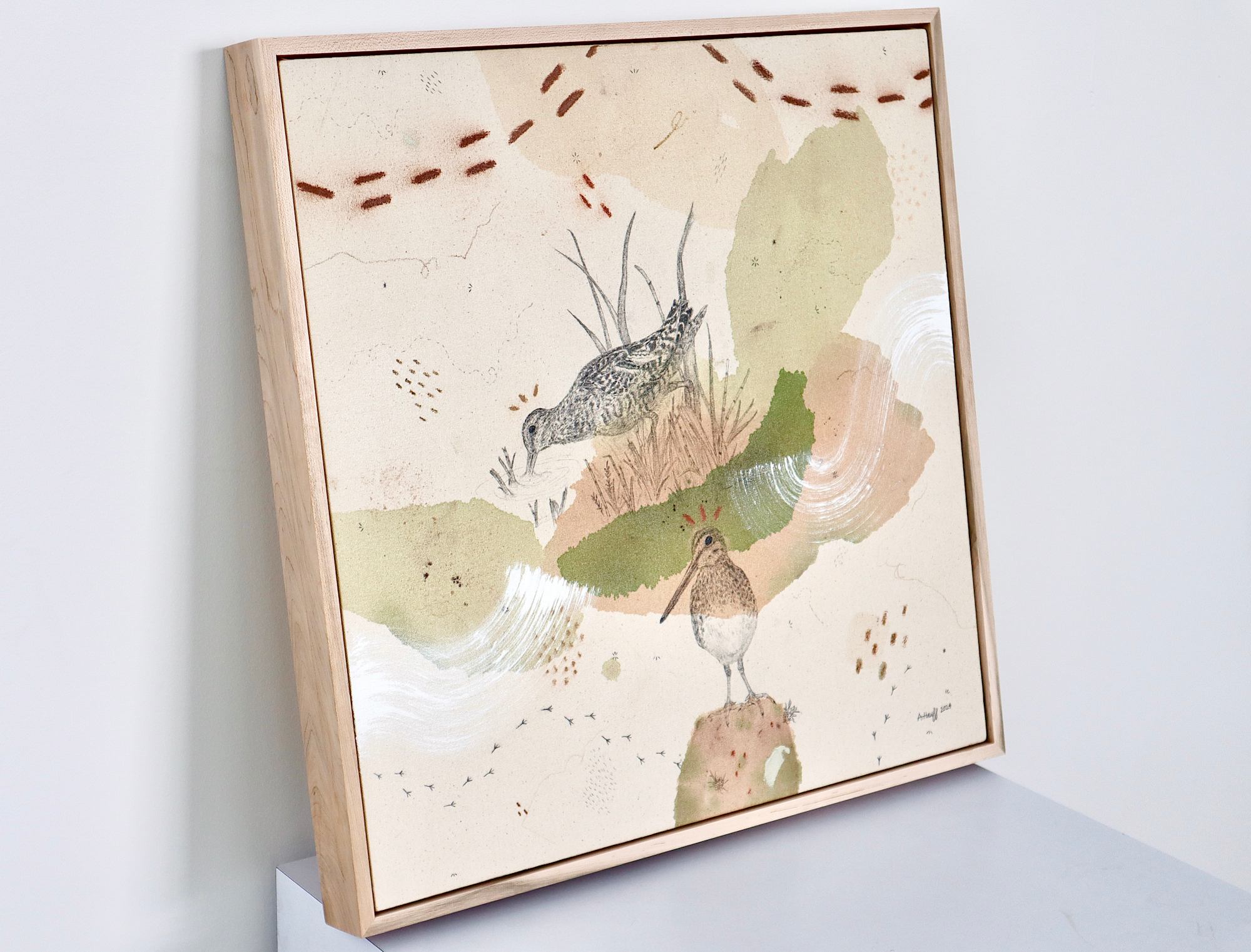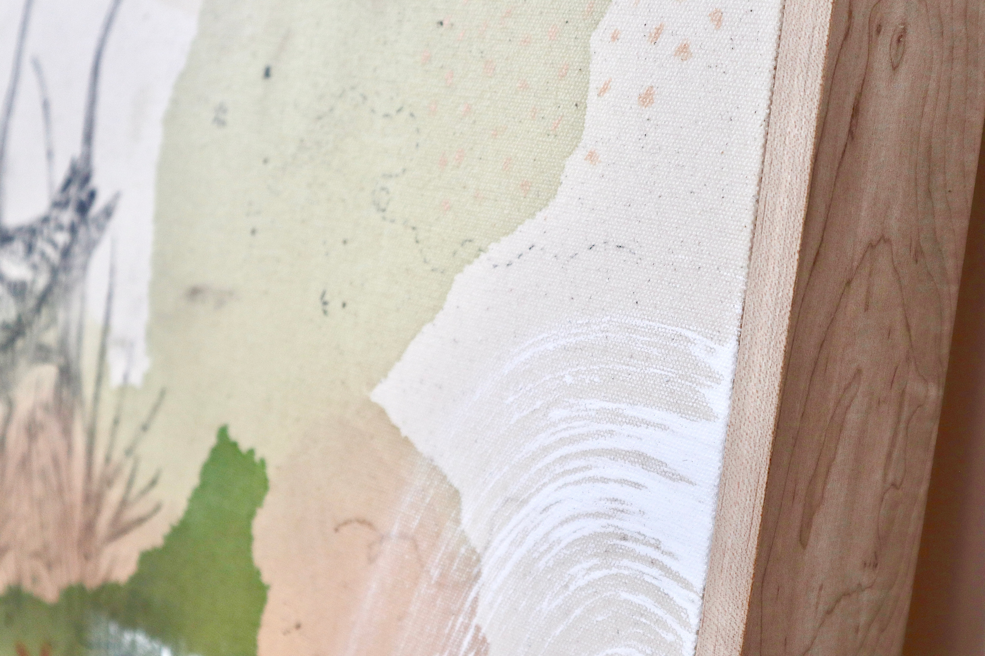 Original mixed media on raw stretched canvas with maple float frame. Alternative hardwood frames available upon request.