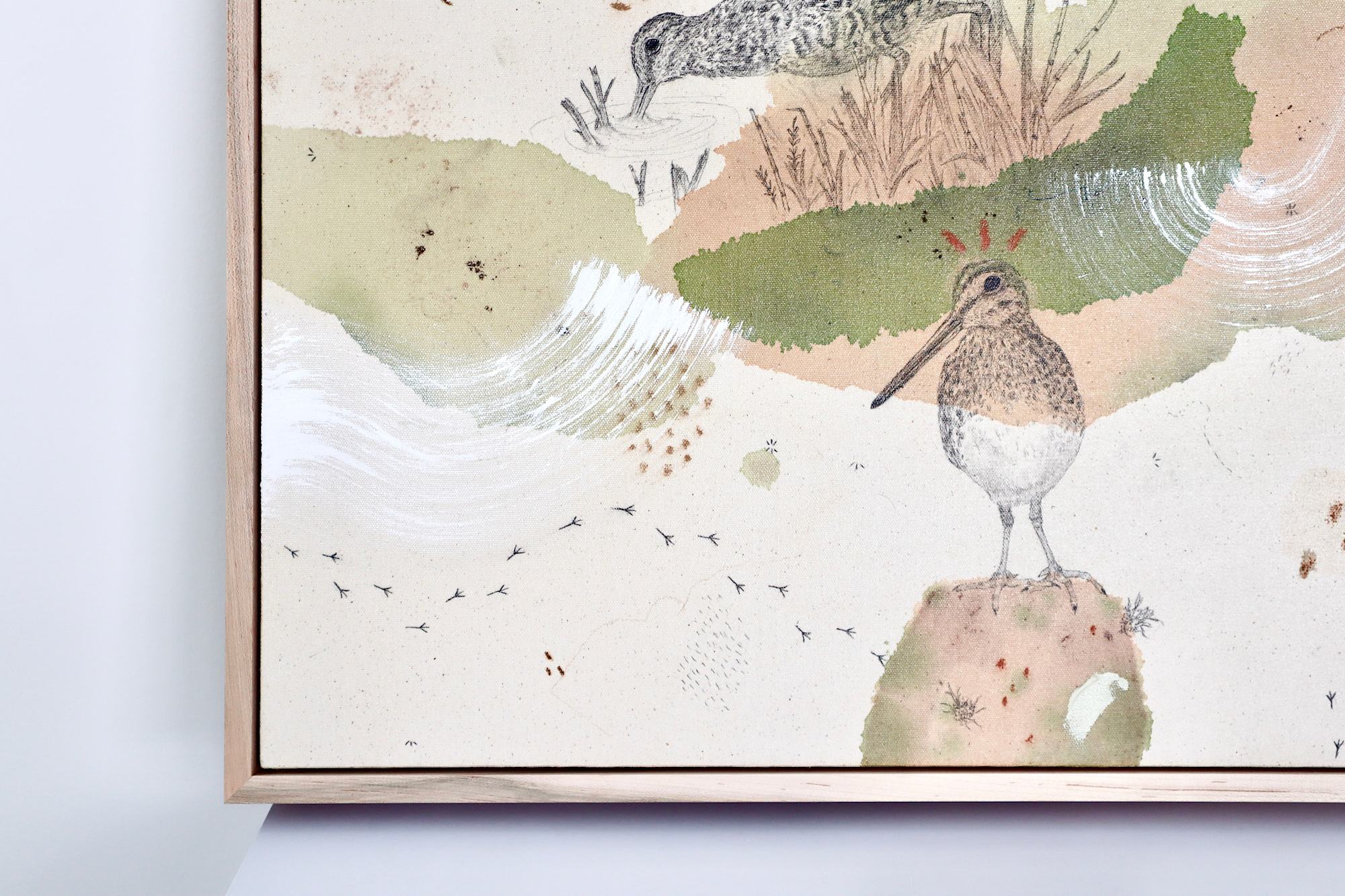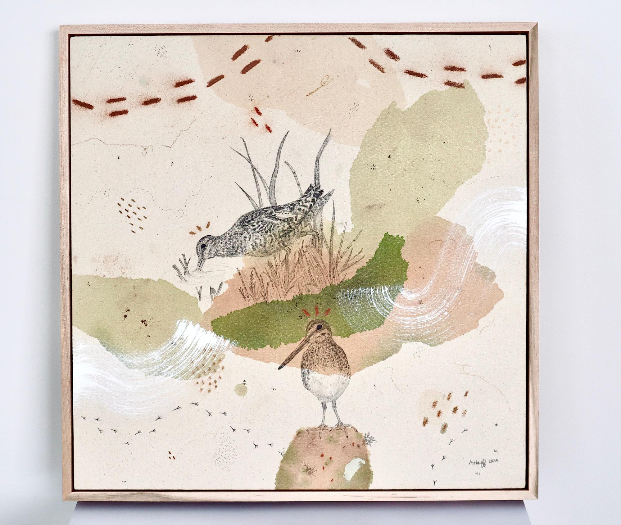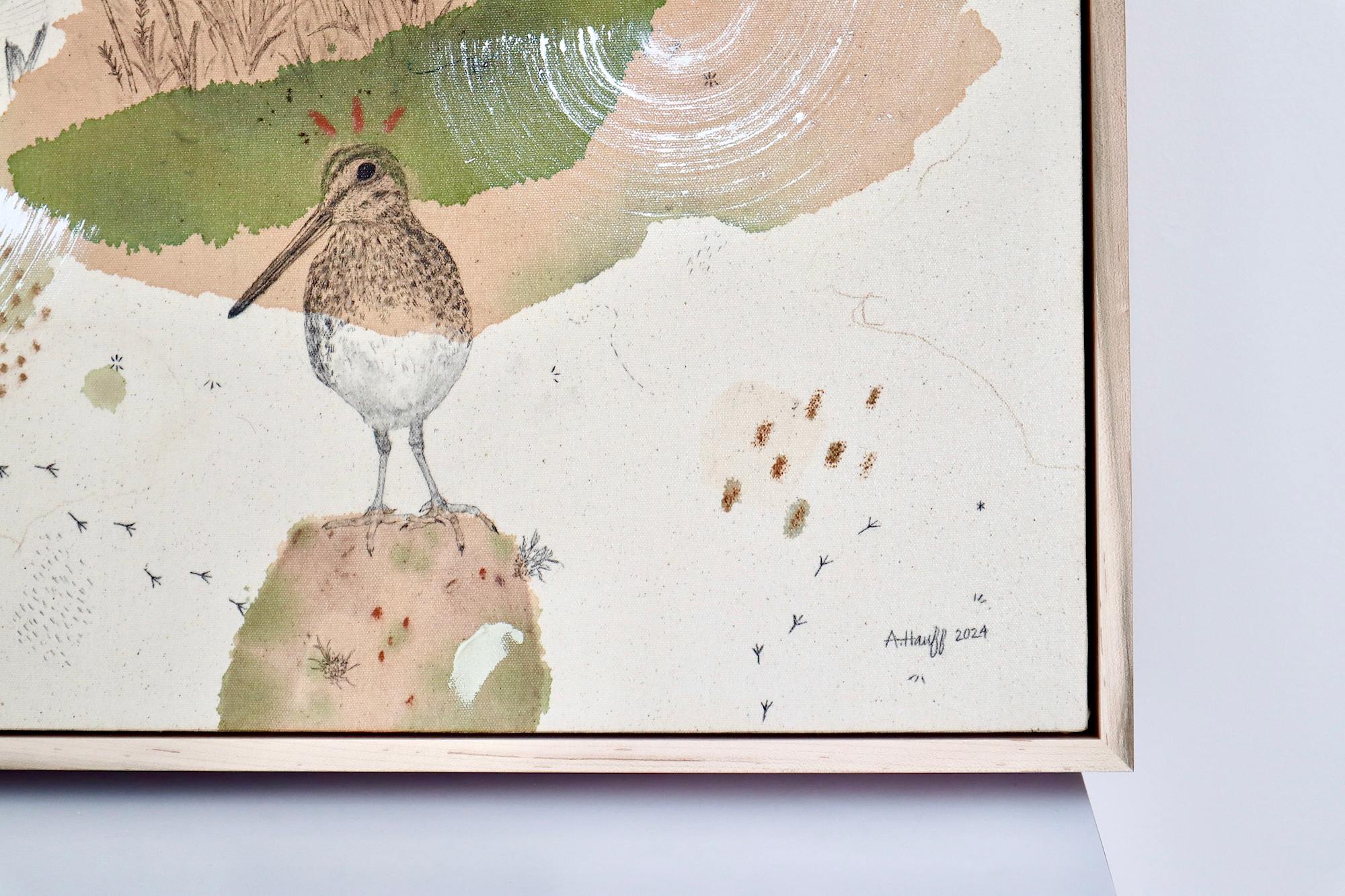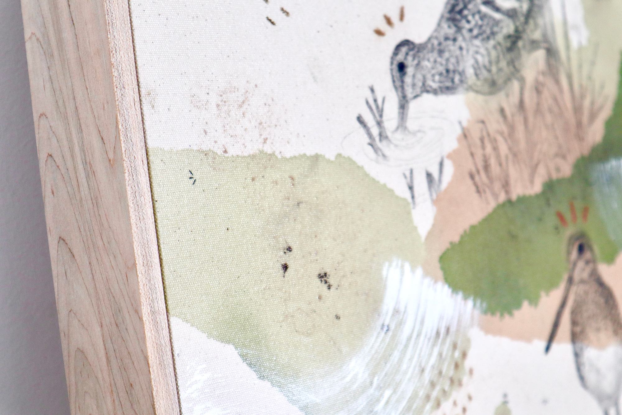 Original mixed media on raw stretched canvas with maple float frame. Alternative hardwood frames available upon request.