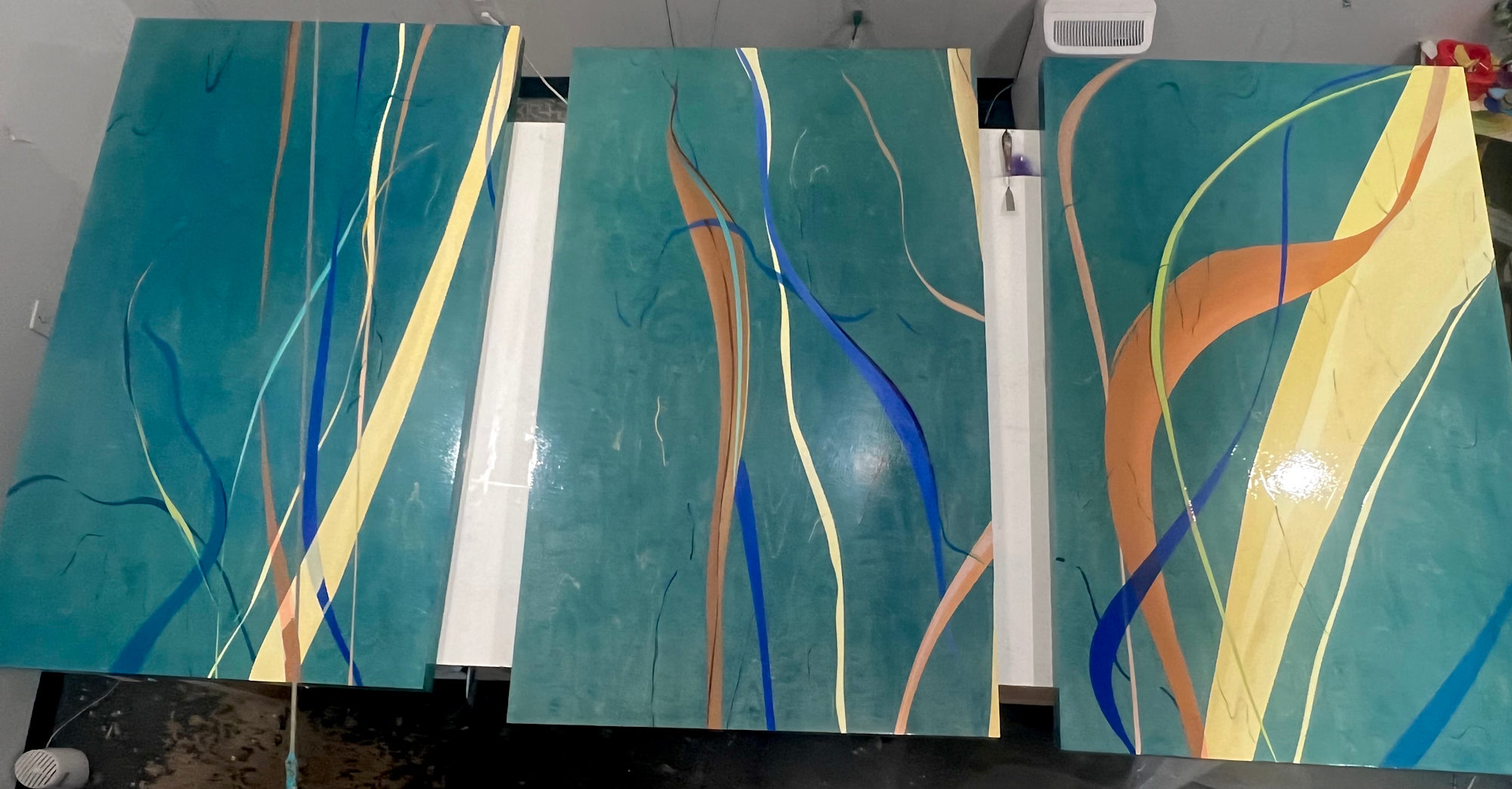 Artwork commissioned through Art + Artisans for client Houlihan Lokey in Dallas, TX. Painting style and colors inspired by my Creekside and Drought Tolerant series of artworks.