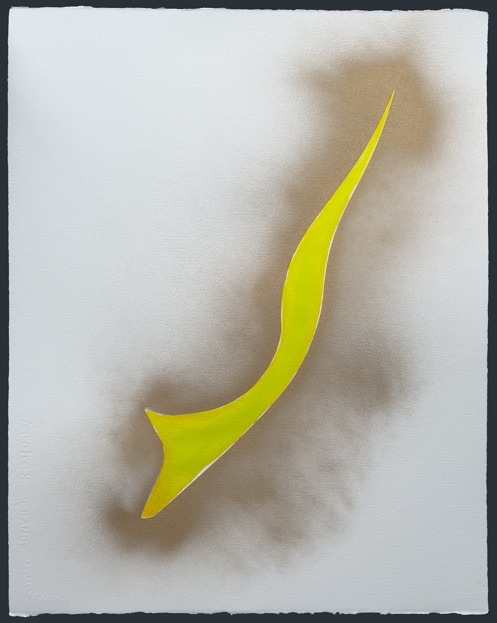 Created during my September residency with the Pouch Cove Foundation in Newfoundland. Inspired by Mistaken Point, a UNESCO World Heritage Site where thousands of the earliest known animal fossils are exposed on cliffsides facing the Atlantic. The simple shapes look like plants or sea sponges; the animals died out about 530 million years ago. I imagine their continued timeline, diversifying, evolving, migrating. Their sprayed outlines mimic the liquid gold of sunset shimmering off the ocean waves that surround them.