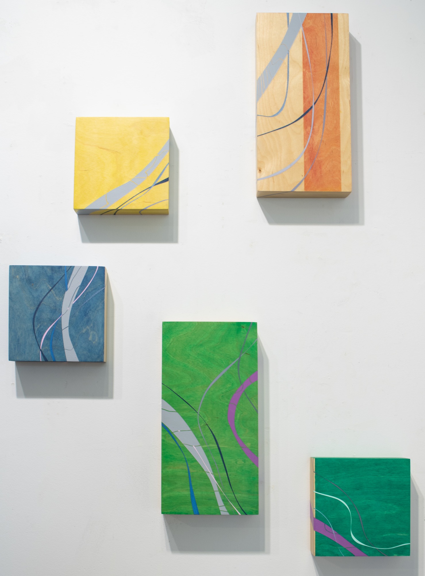 One in a series of 47 wood panels, each representing a year of my life. The timeline was completed for my 2020 show at the Georgetown Art Center, but is now incomplete as I've grown older. I made this work for a show with other artists who all paint on wood and use the grain lines visually and conceptually. I wanted to more concretely connect the grain--each line, one year of the tree's life--to myself. Every painting has a different base color, a nod to the ways the way we physically and emotionally change from year to year. Like lessons learned from past experiences or connections made, lost and reestablished over time, they feature bold and subtle lines weaving from one panel to the next. Every panel also features exposed raw wood, a reminder that underneath all of the paint and life experiences remains something more primal and connected to nature.