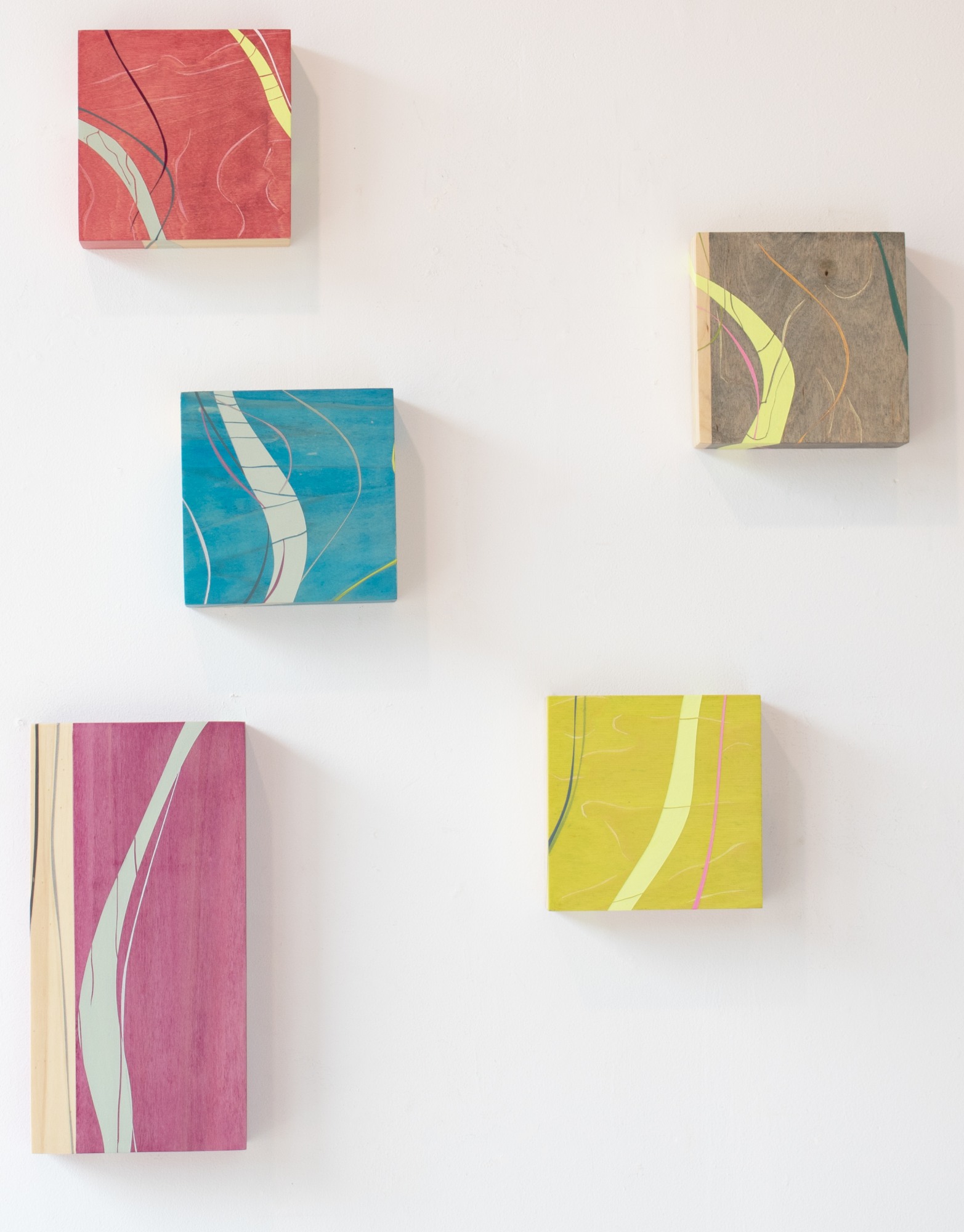 One in a series of 47 wood panels, each representing a year of my life. The timeline was completed for my 2020 show at the Georgetown Art Center, but is now incomplete as I've grown older. I made this work for a show with other artists who all paint on wood and use the grain lines visually and conceptually. I wanted to more concretely connect the grain--each line, one year of the tree's life--to myself. Every painting has a different base color, a nod to the ways the way we physically and emotionally change from year to year. Like lessons learned from past experiences or connections made, lost and reestablished over time, they feature bold and subtle lines weaving from one panel to the next. Every panel also features exposed raw wood, a reminder that underneath all of the paint and life experiences remains something more primal and connected to nature.