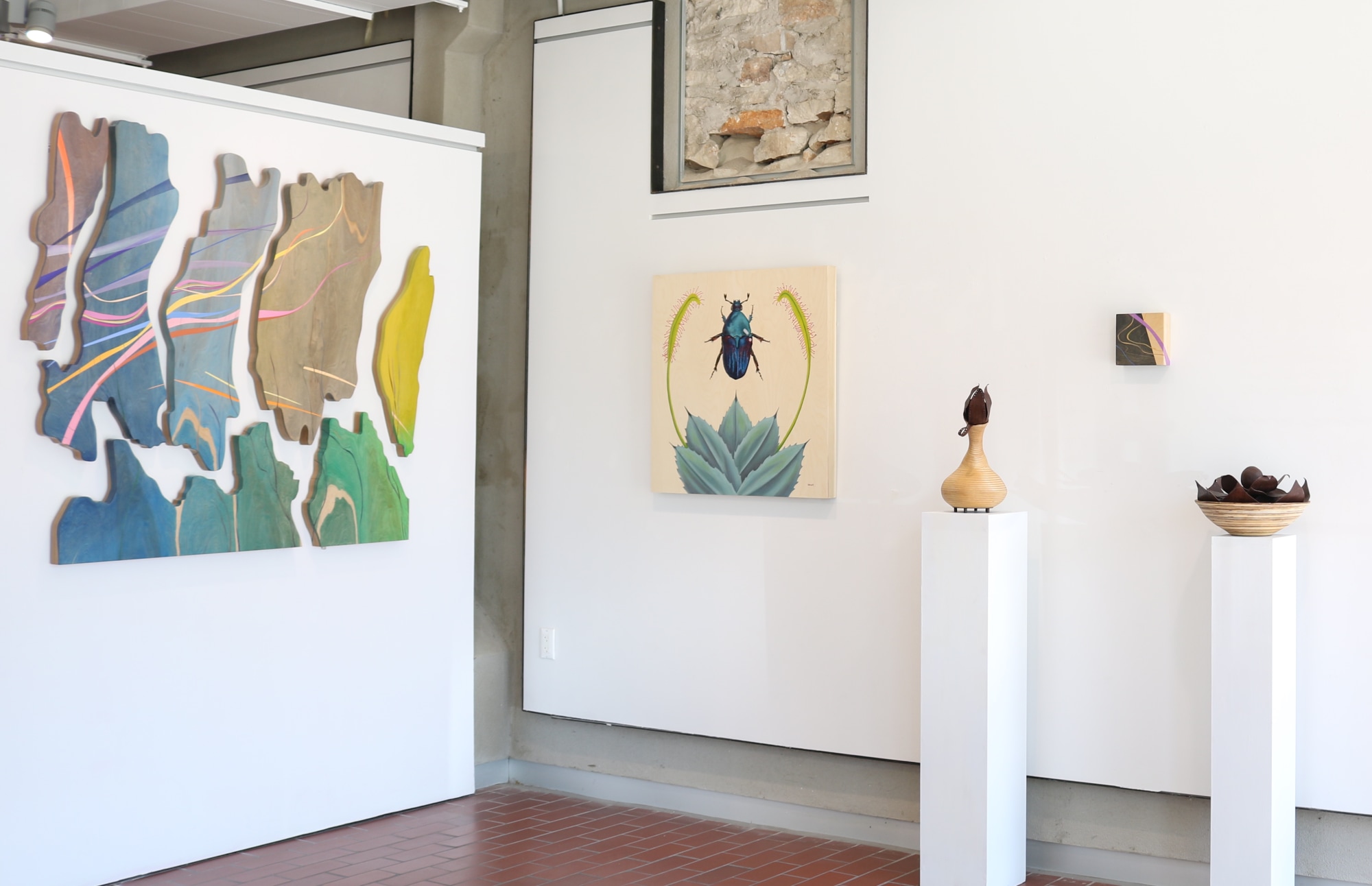 These paintings are also a deeper exploration within my art practice of processes to bring the lines of the wood grain into sharper focus. The organic-shaped panels were fabricated to follow curving lines of wood grain.