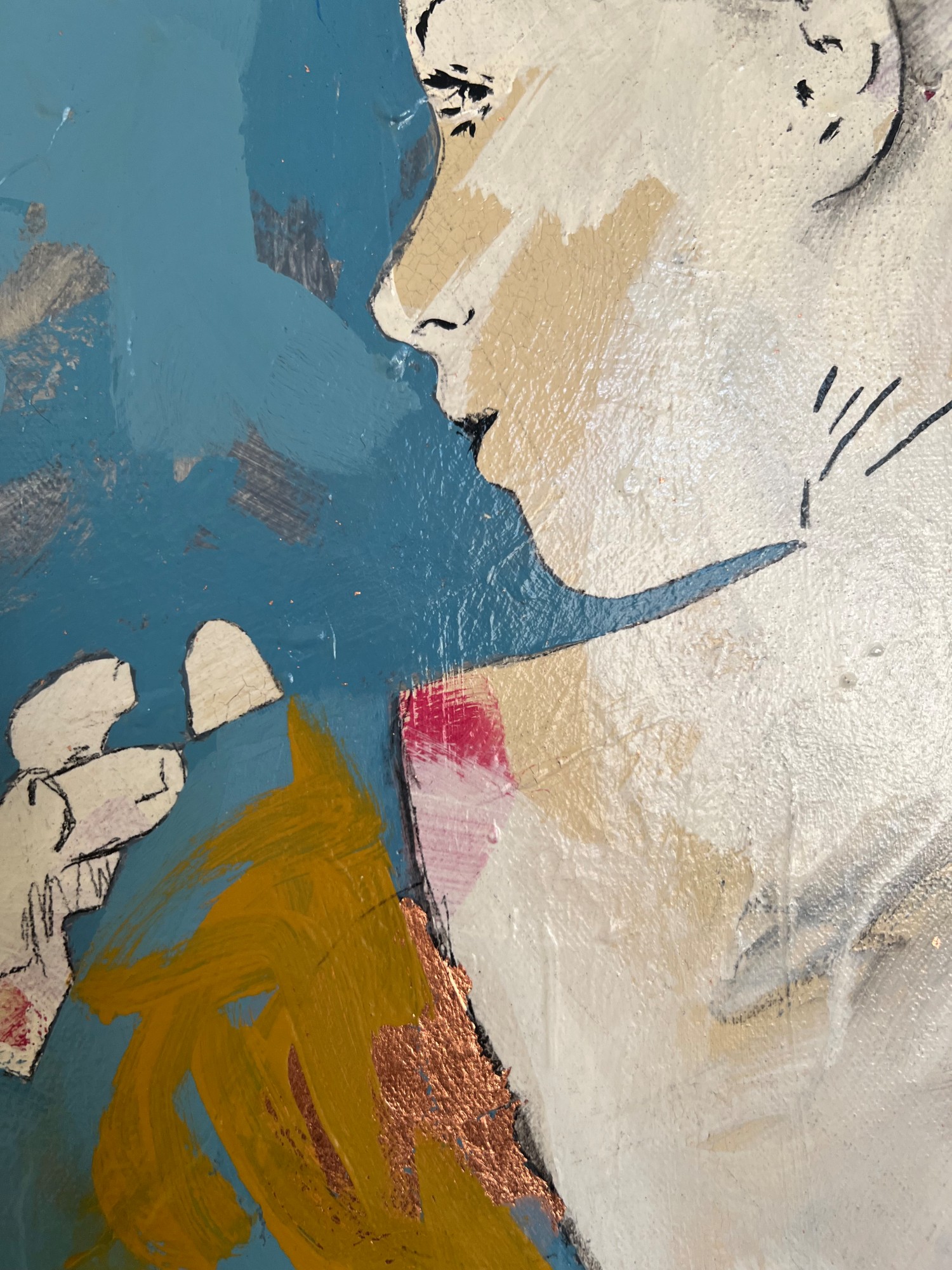 This artwork speaks volumes through subtlety, offering a glimpse into a narrative where the ethereal meets the tangible. The fusion of acrylic and gold leaf creates a mesmerizing interplay of textures and hues, casting an alluring aura around her profile. Experience the intermingling of abstraction and the semblance of a figure, inviting interpretation and immersion into a world where artistry meets intrigue.