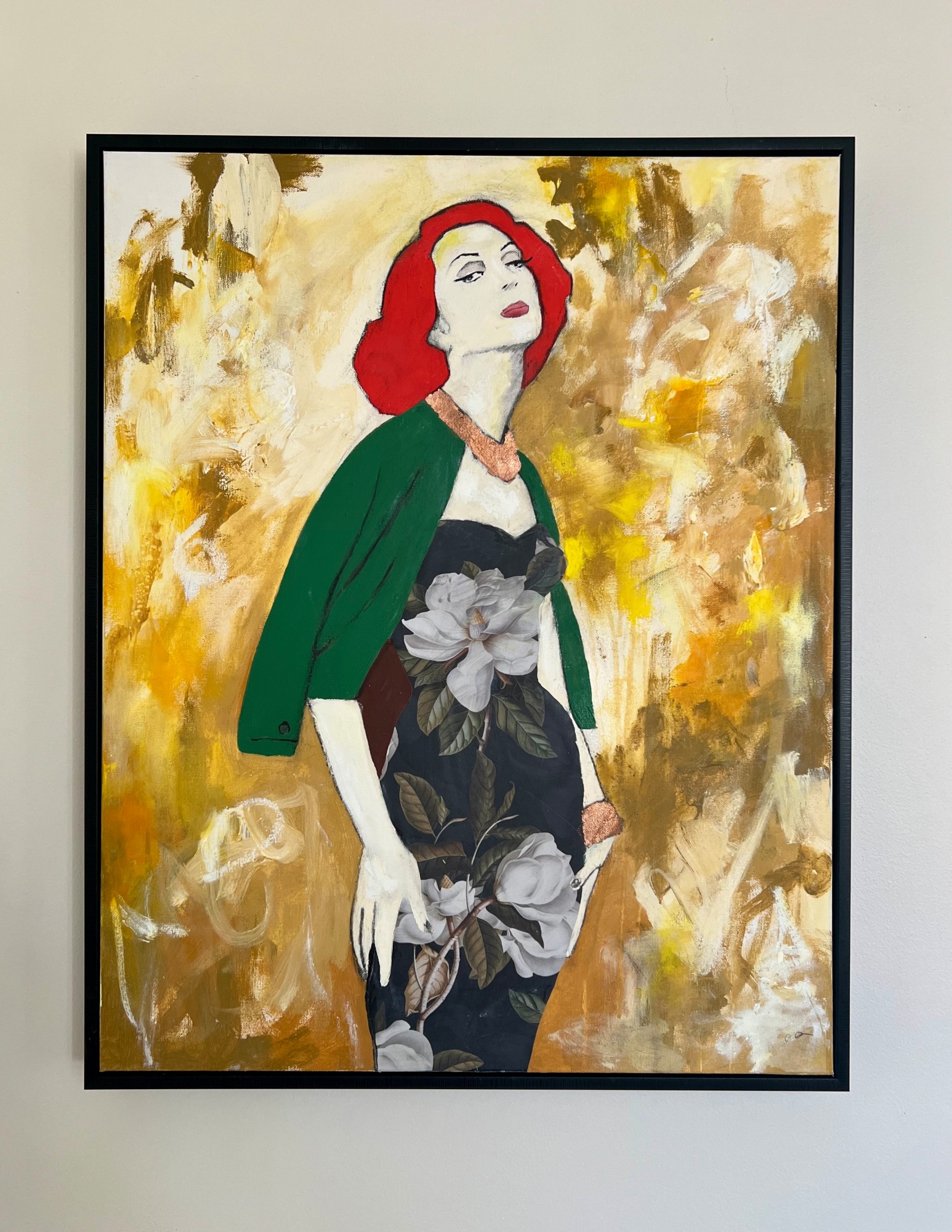 Introducing "Gertrude," a striking masterpiece crafted on canvas using a blend of acrylic, cold wax, and wallpaper. This evocative artwork draws inspiration from the essence of mid-century women, capturing their strength and allure. With fire-red hair cascading around her, Gertrude commands attention with an intense gaze, her eyes carrying stories yet untold.