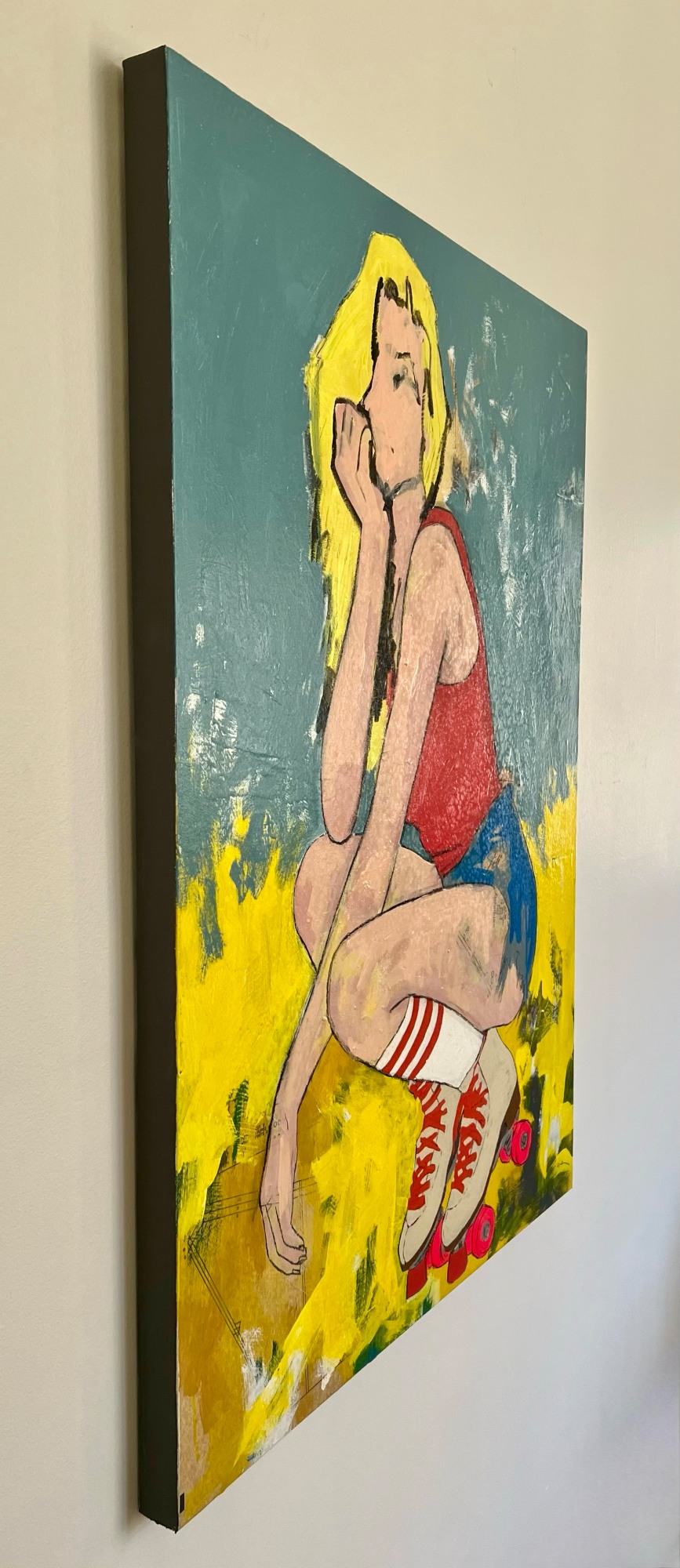 "Roller Girl" is a vibrant contemporary acrylic painting that seamlessly blends elements of figurative and abstract artistry. Serving as a nostalgic throwback to the carefree spirit of the 1980s, the artwork exudes a palpable sense of nostalgia and joy. The central focus of the piece is a dynamic figure depicted in mid-stride, exuding a sense of movement and vitality reminiscent of roller skating rinks of yesteryears. However, what sets "Roller Girl" apart is the artist's masterful distortion of the figure's face within the abstracted elements surrounding her. In this distortion, the figure's facial features become indistinct, allowing viewers to project their own memories and experiences onto her, thereby imbuing the painting with a universal quality that transcends individual identity. Through its blend of figurative and abstract elements, "Roller Girl" captures the essence of carefree abandon and youthful exuberance, inviting viewers to reminisce and revel in the joy of simpler times.