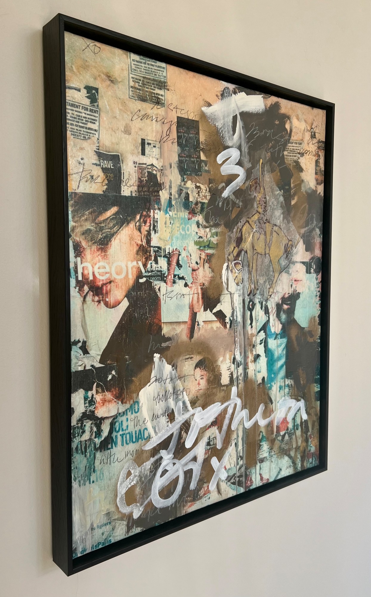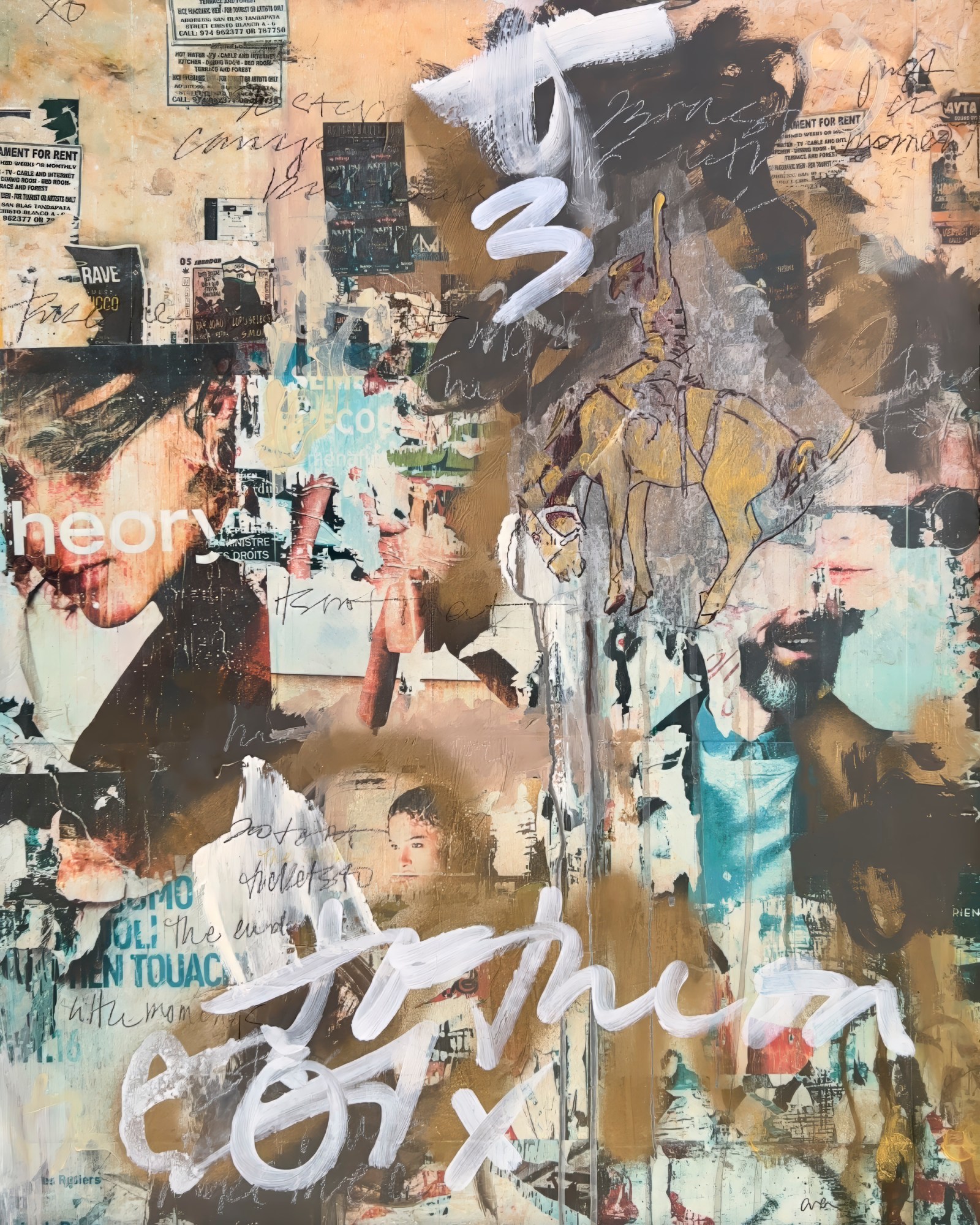 "Urban Pasture" captures the essence of contemporary urban life through a mesmerizing fusion of torn advertisements and iconic American imagery. The torn fragments of advertising posters, symbolic of our consumer-driven society, serve as a lens through which viewers confront notions of beauty and lifestyle.