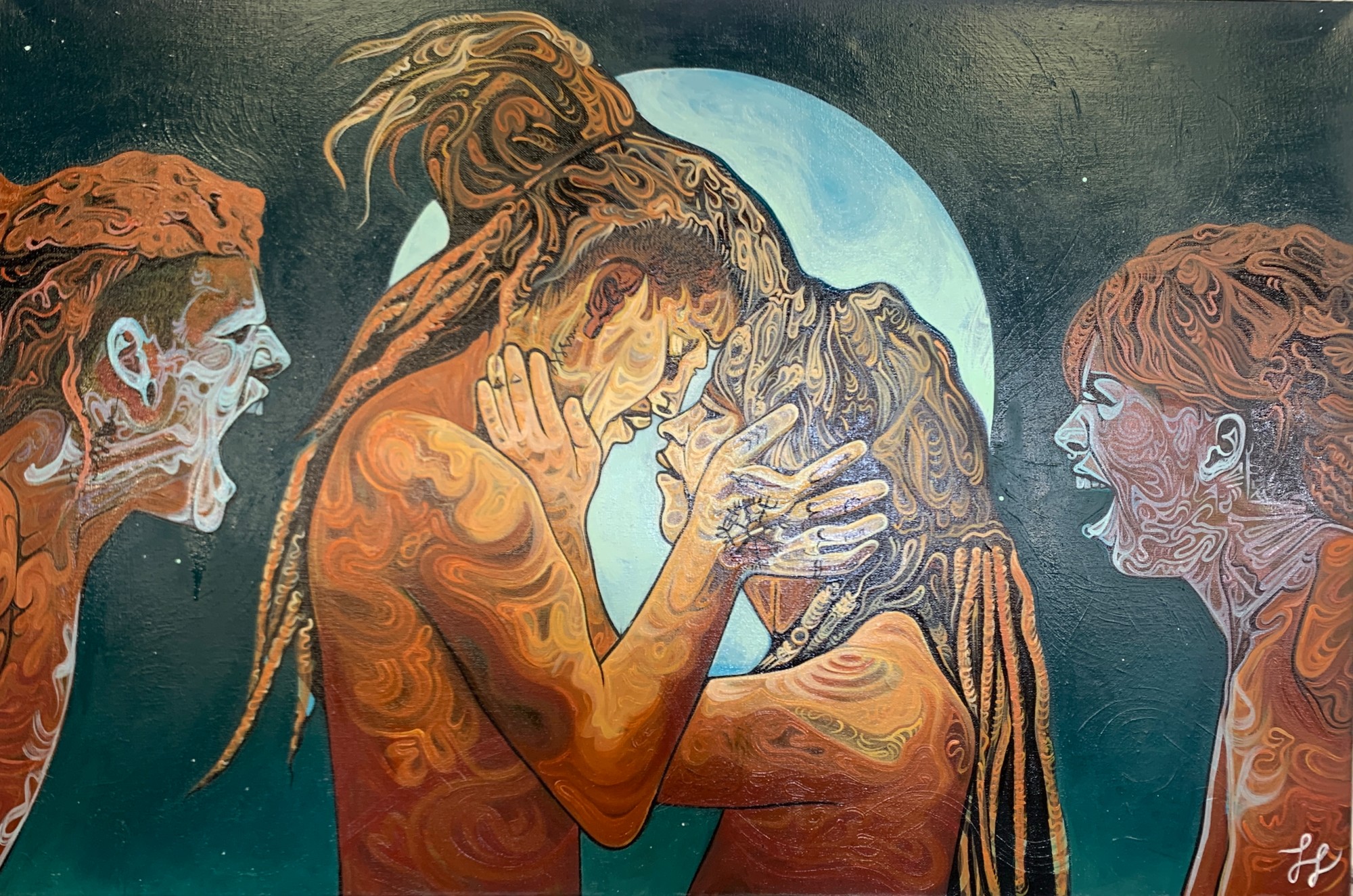 As an artist I seek to deliver a visionary experience through my paintings, that ask questions only the viewer can answer for themselves. Better yet, my work communicates to the human race what I have learnt along the way. Reflecting who the messiah is in myself. My creational purpose longs to build bridges between the hearts of all creation, gaining a better understanding of the question we all ask ourselves, “What on Earth am I here for?”
