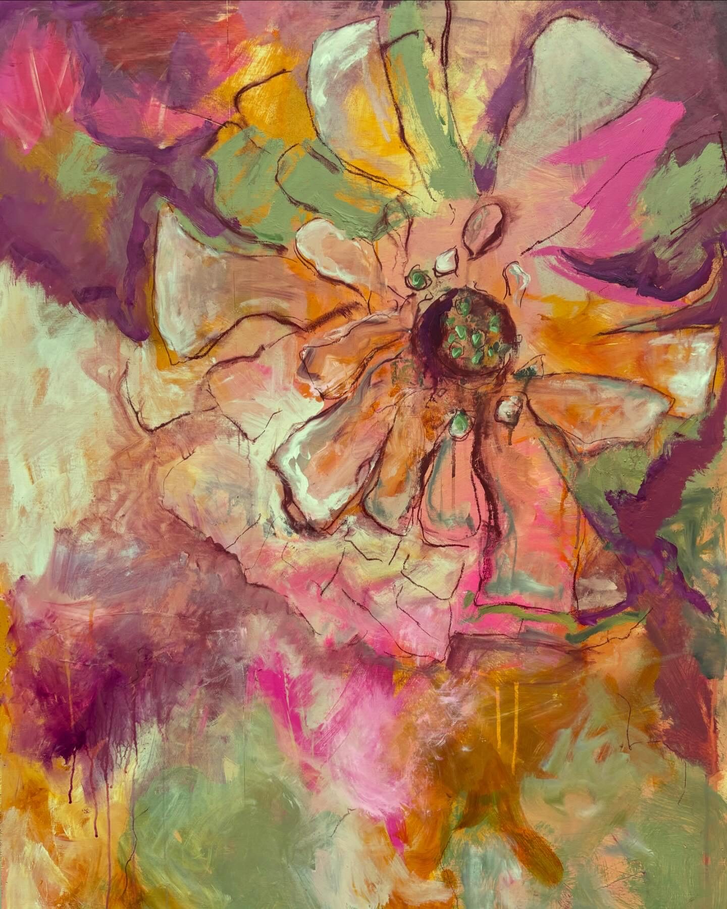 Inspired by Zinnias from a Summer/Fall Garden grown for my daughter's wedding, this piece is a special one. Swaths of bold, yet etherial colors of peach, deep plum, pinks, and other accents dance around the floral shapes made by marks of pastel. One of my Favorites!