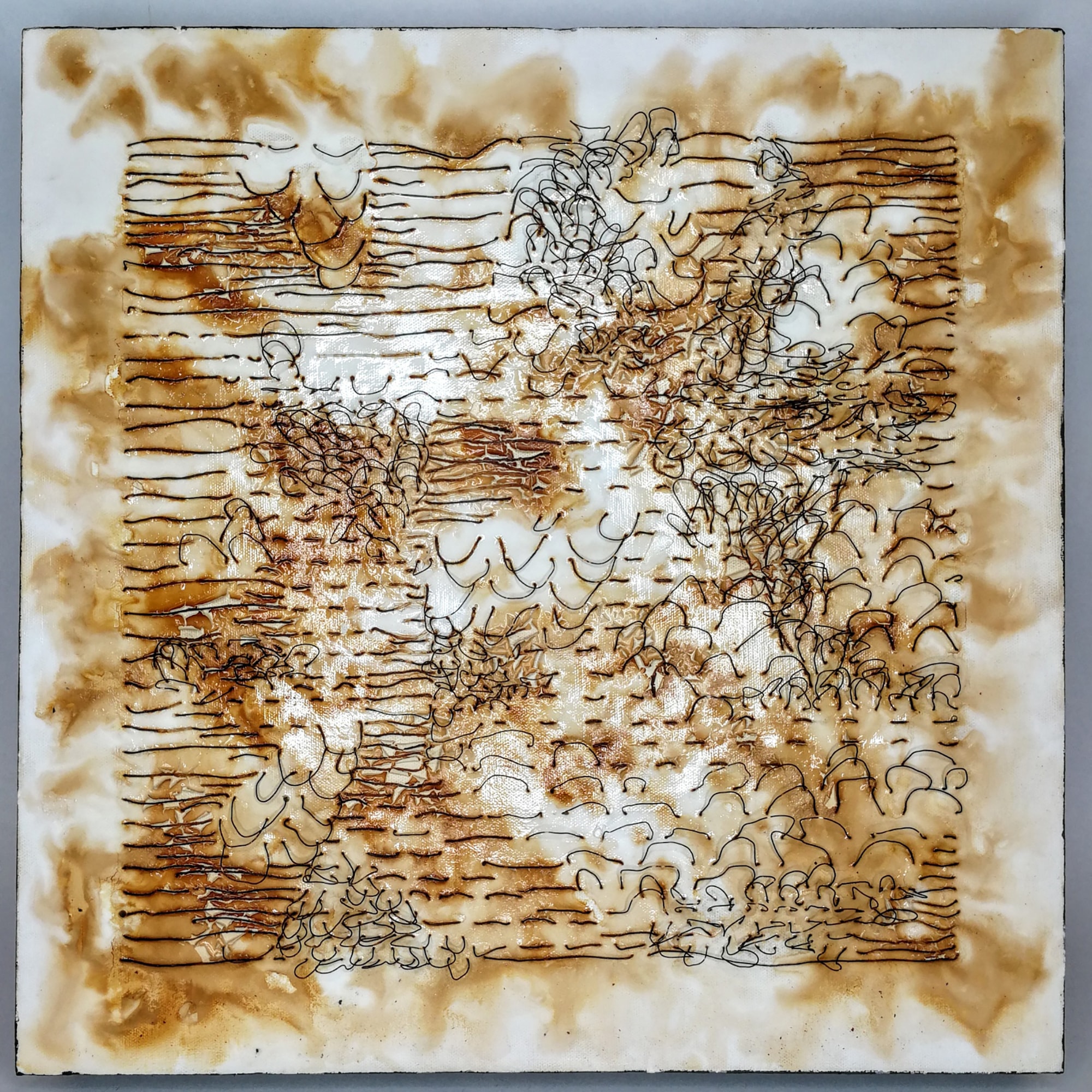 Wire stitched into the canvas and oxidized creates intricate textured surfaces.