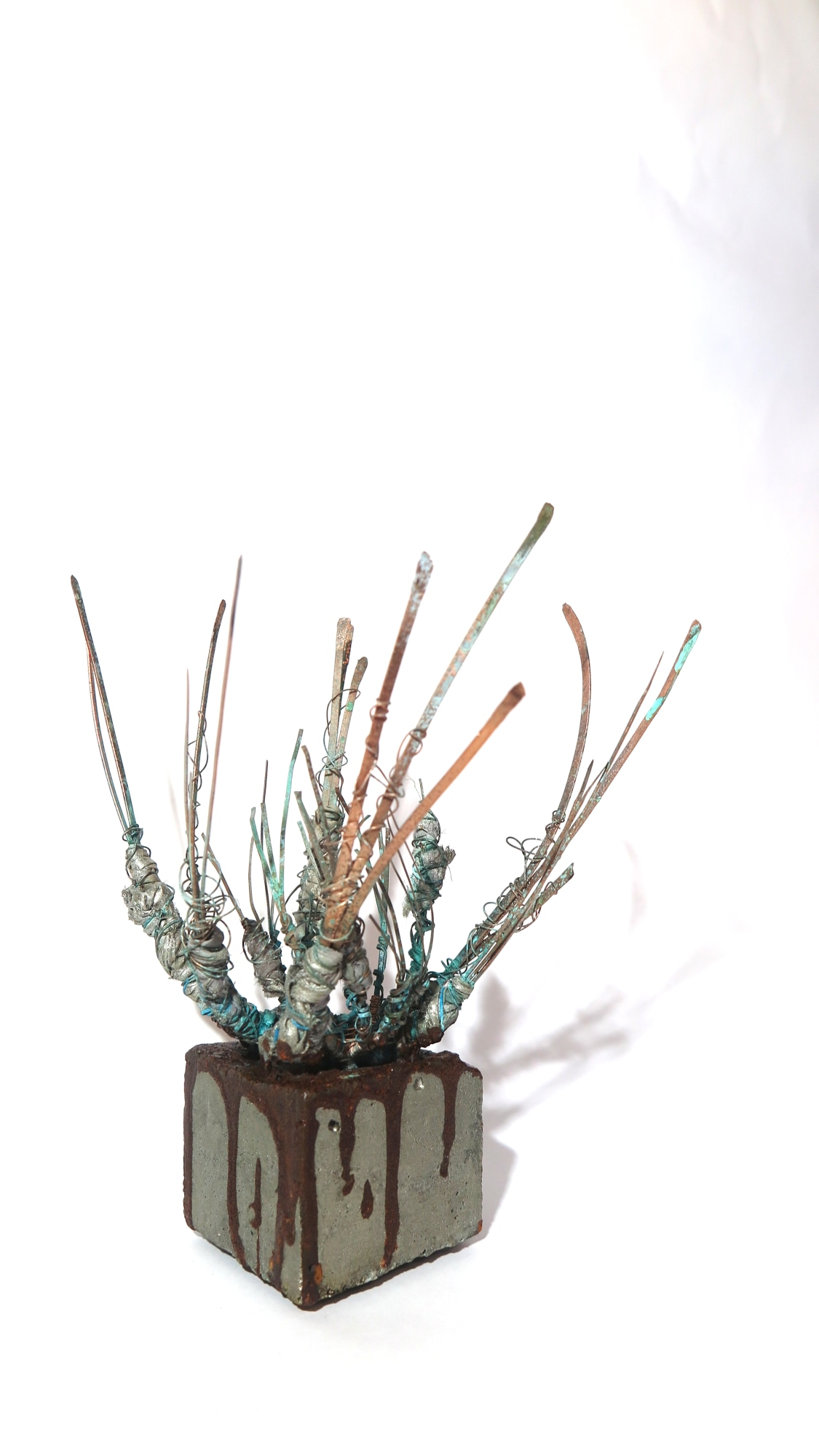 Small sculpture with basketry techniques and oxidised surface.