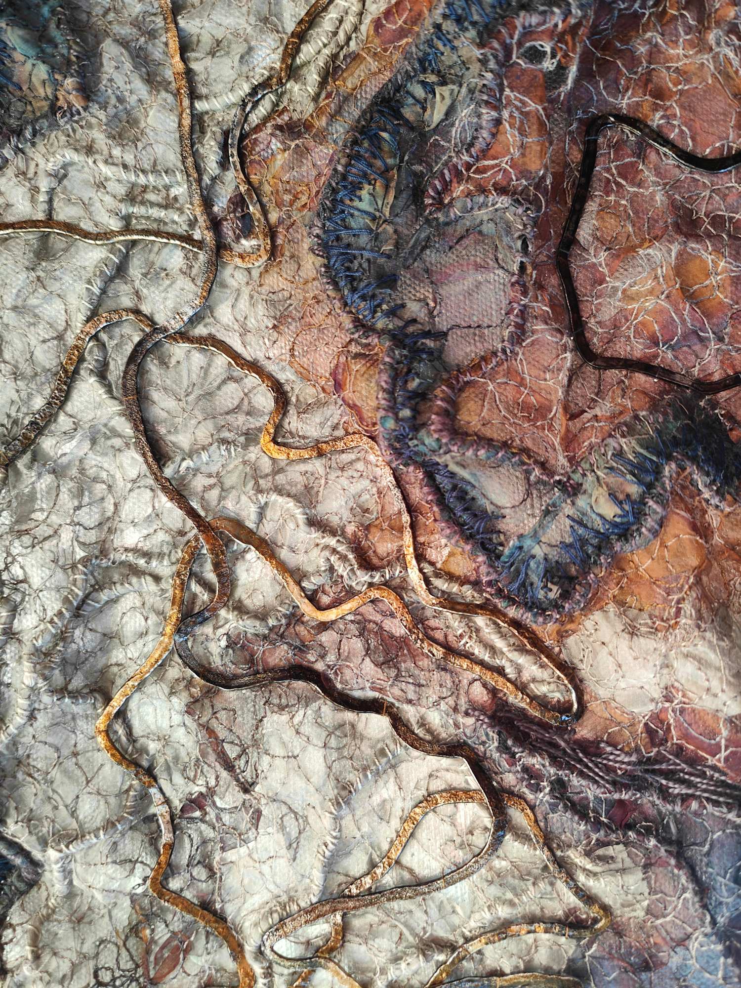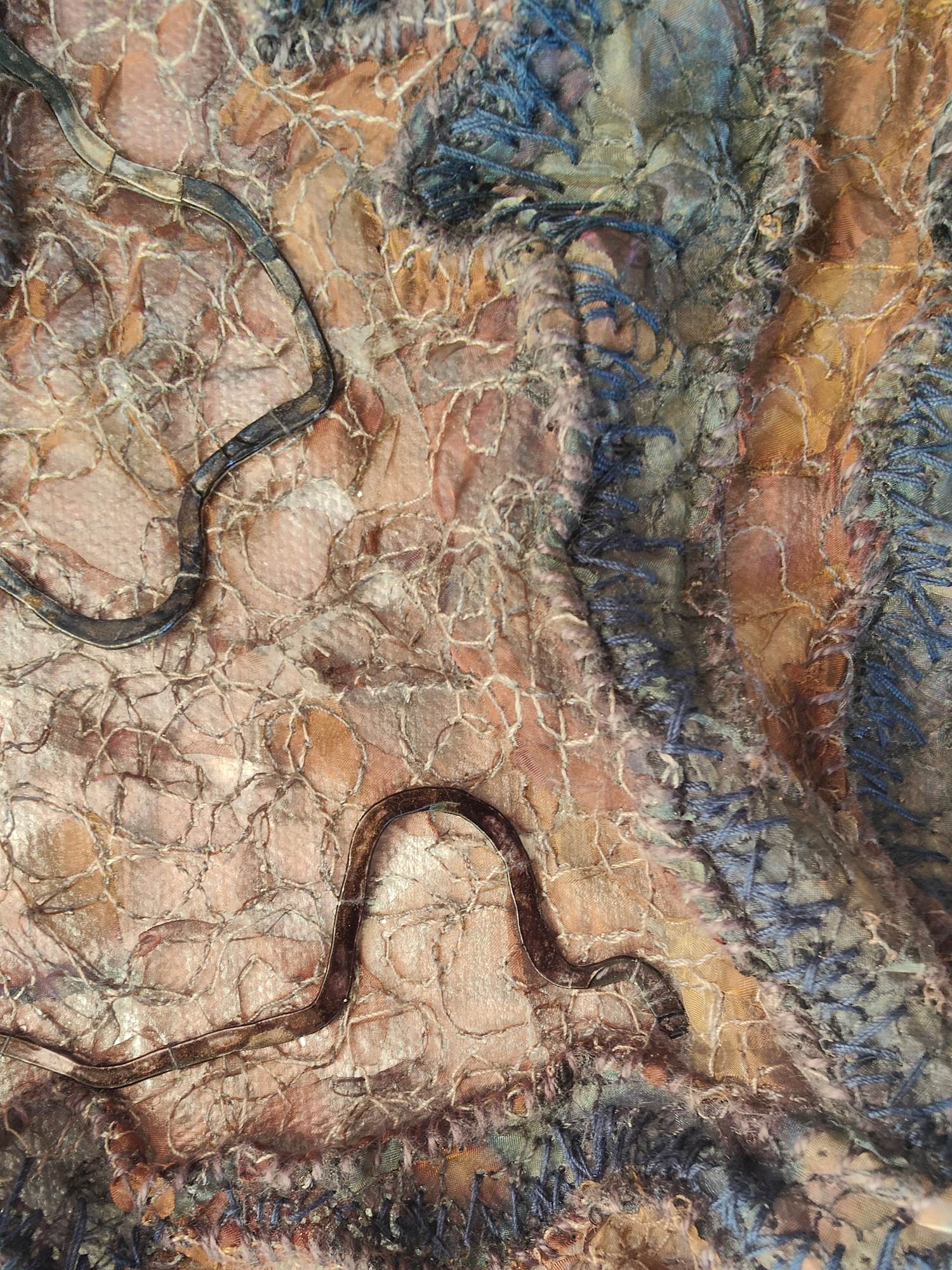 A richly textured textile artwork that captures the essence of erosion and transformation, using layers of stitched and sculpted fibres to create an intricate, almost topographical surface. The organic flowing lines contrast with the square format of the piece, creating an interesting tension between contained structure and natural, unrestricted flow. Earthy tones and winding lines evoke the passage of time, the movement of water, and the shifting of land. The textured surface is held over a canvas gilded in silver coloured metal allowing light and reflectivity,. The canvas is placed in a floater frame painted black with a delicate hint of irridescent blue.