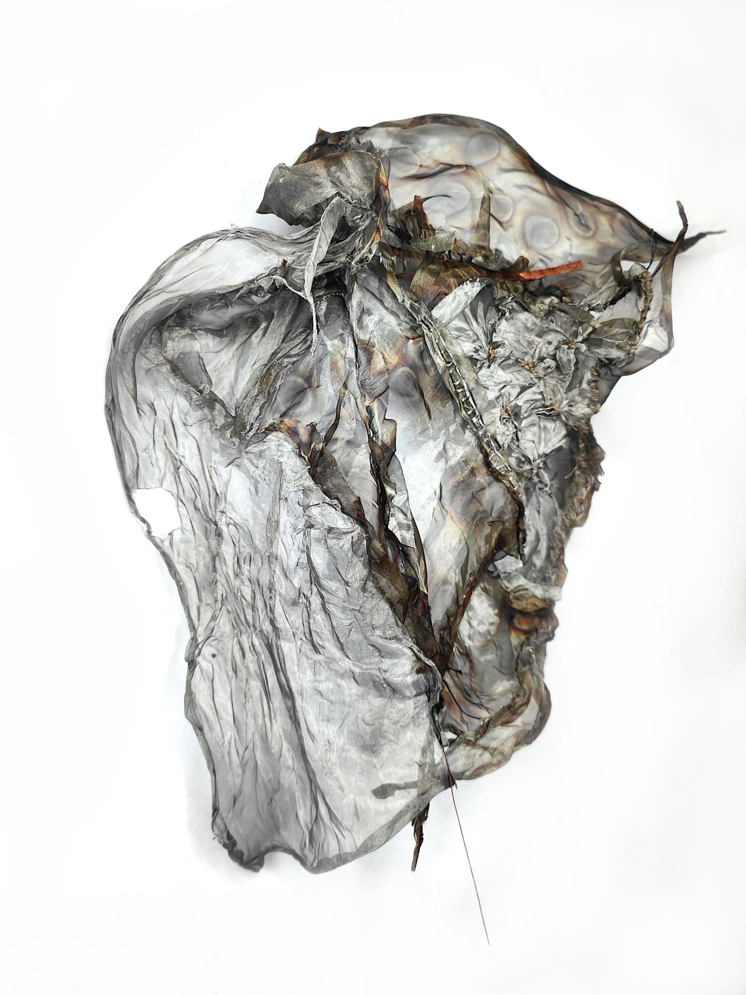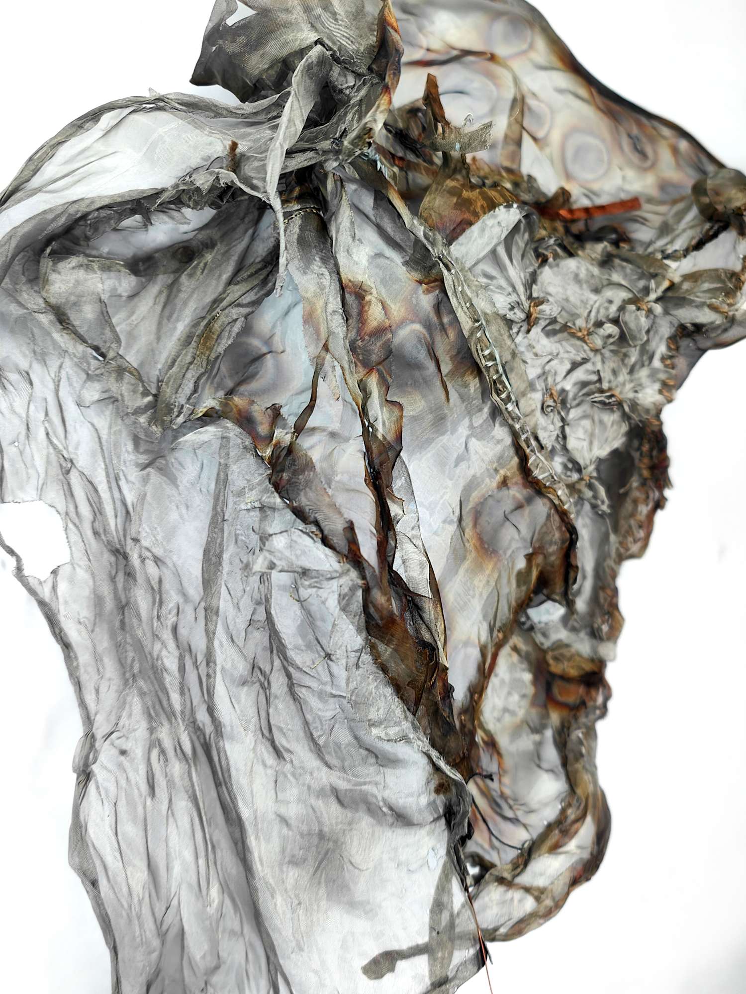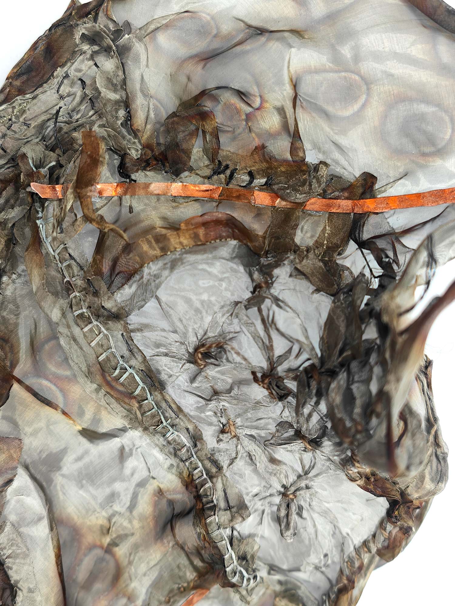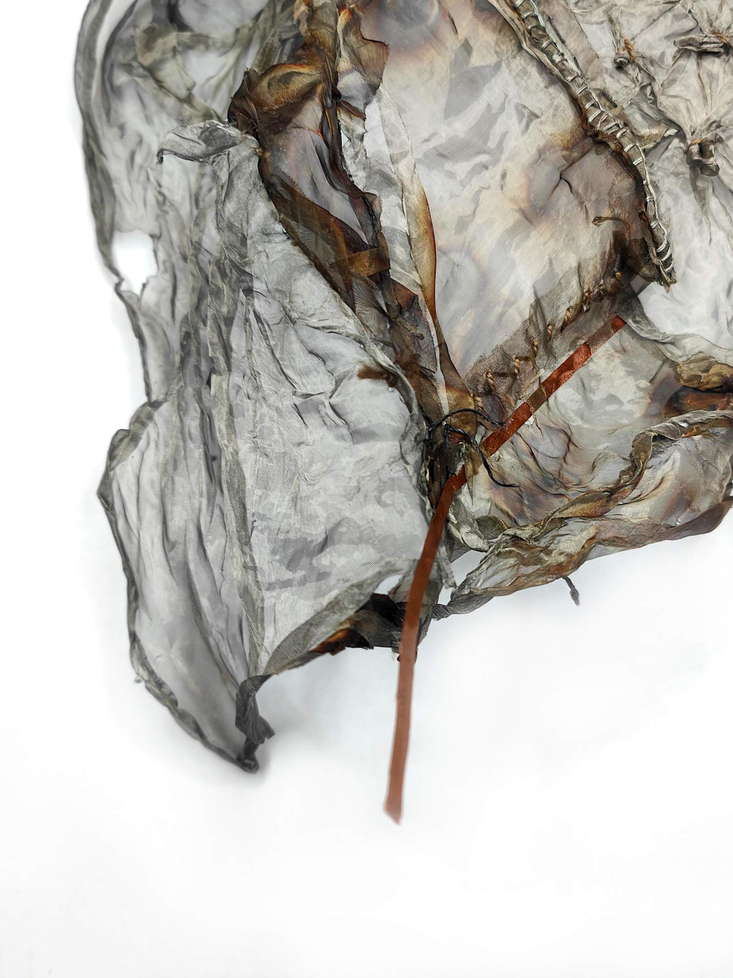 Delicate yet resilient, these sculptural forms are shaped from translucent stainless steel mesh, textured and heat-treated to create shifting tones and subtle shadowplay. Copper threads and fine wirework trace across the surfaces like currents, roots, or signals, suggesting movement, memory, and interconnection. Each piece feels both ephemeral and enduring — like remnants of wind-swept landscapes, tide-worn kelp, or fleeting thoughts caught mid-formation. This series invites reflection on the unseen forces that shape and tether us — light, tension, and time held in delicate balance.