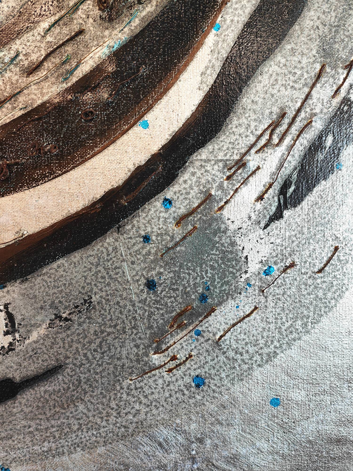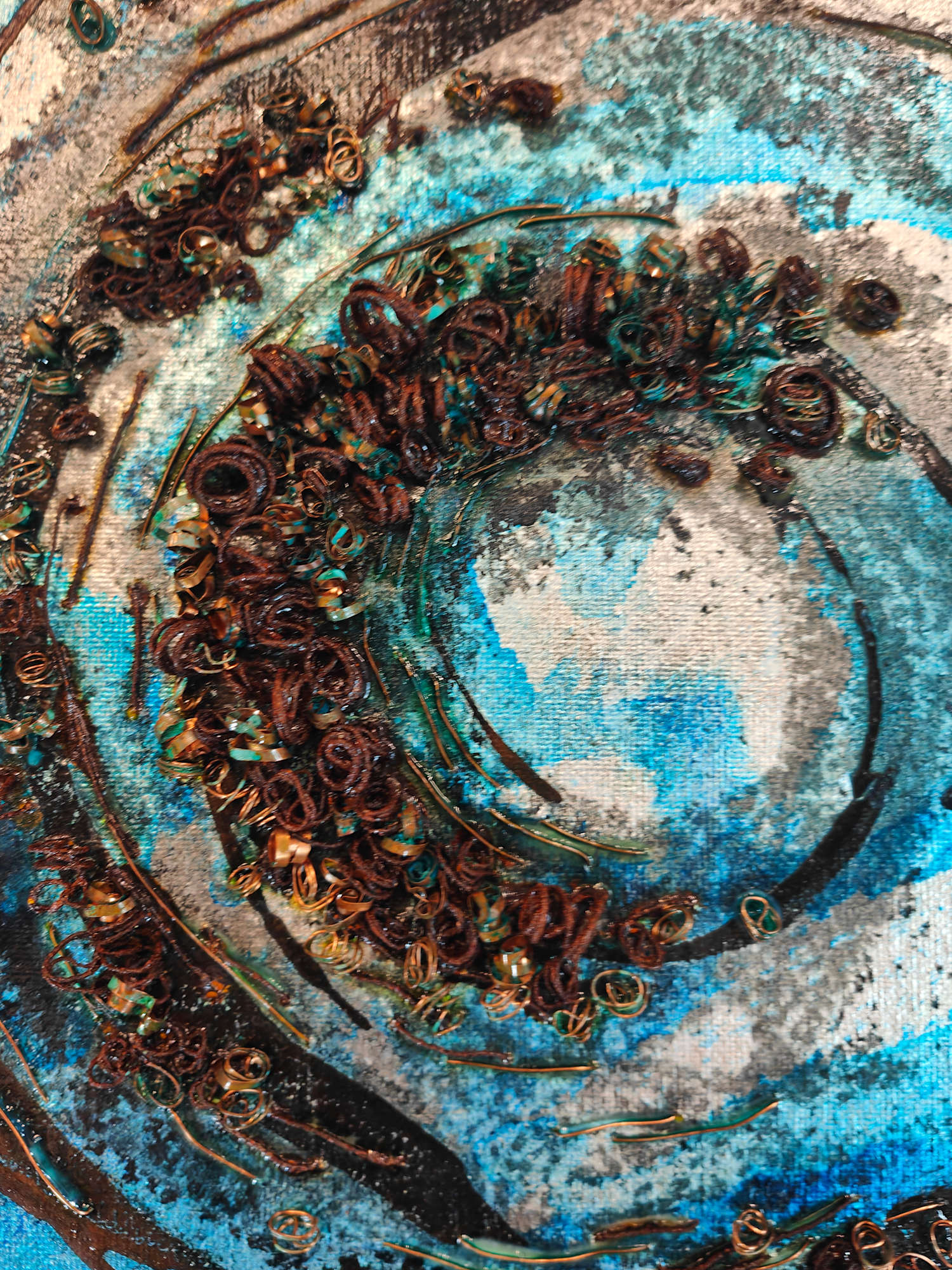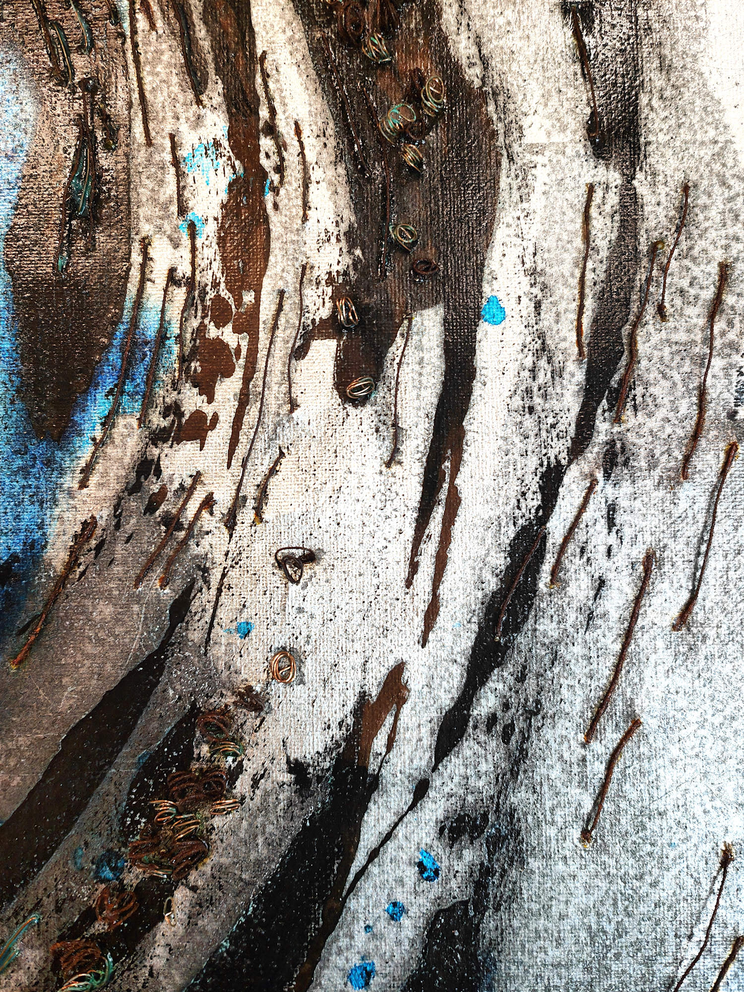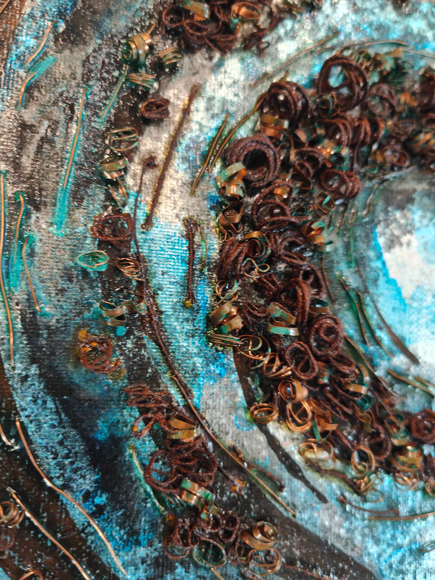 Each of these canvases is covered with gilded surfaces, inks, patinas, and wires in various designs. Wires, including rusted, verdigris, and metallic ones, are layered on top, adding different textures. These works illustrate the interconnectedness of nature through visible and invisible networks.