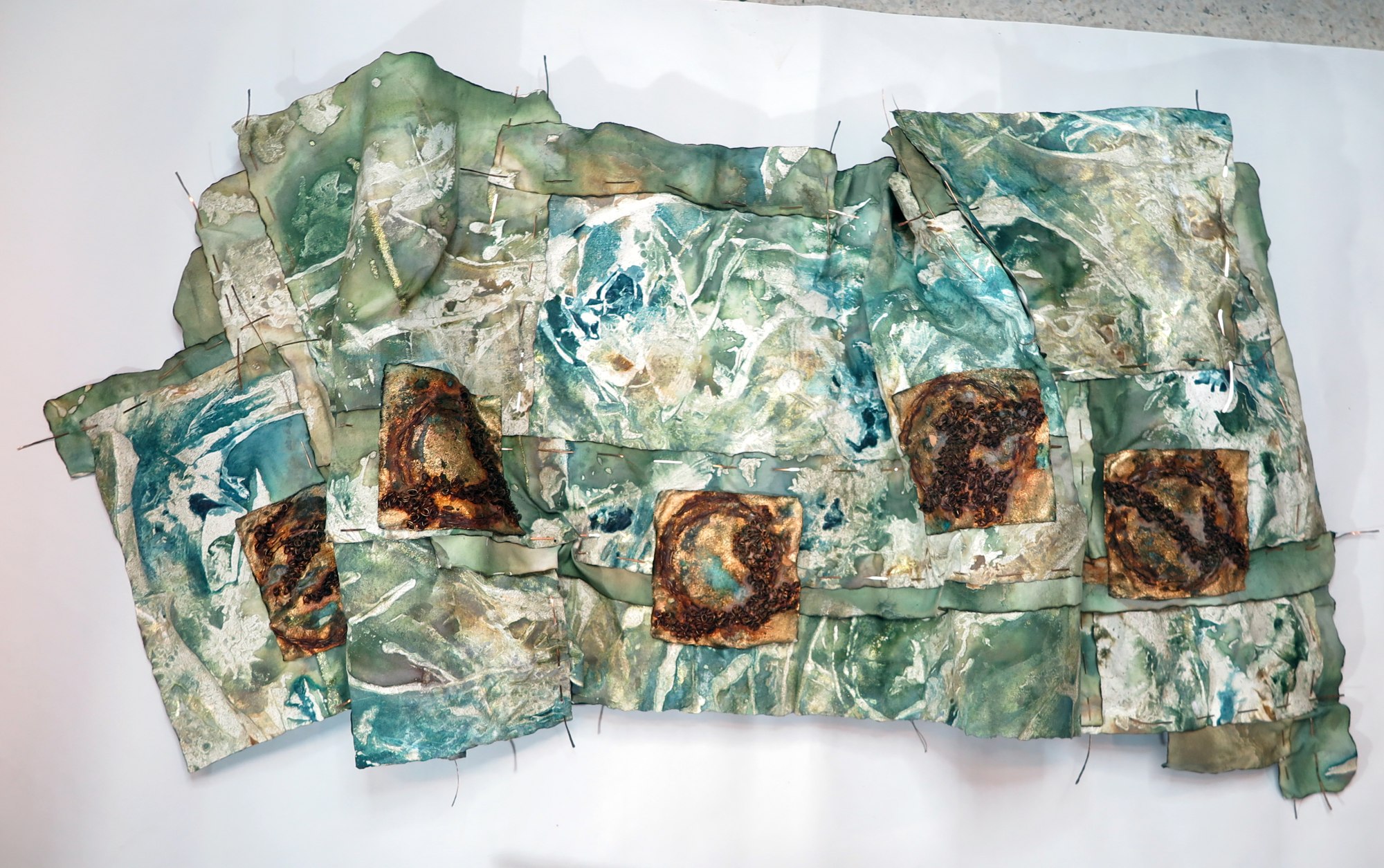Dramatic, folded , painted fabric held together with wire stitching and gilded, oxidised fractured components. Set on a canvas for easy hanging.