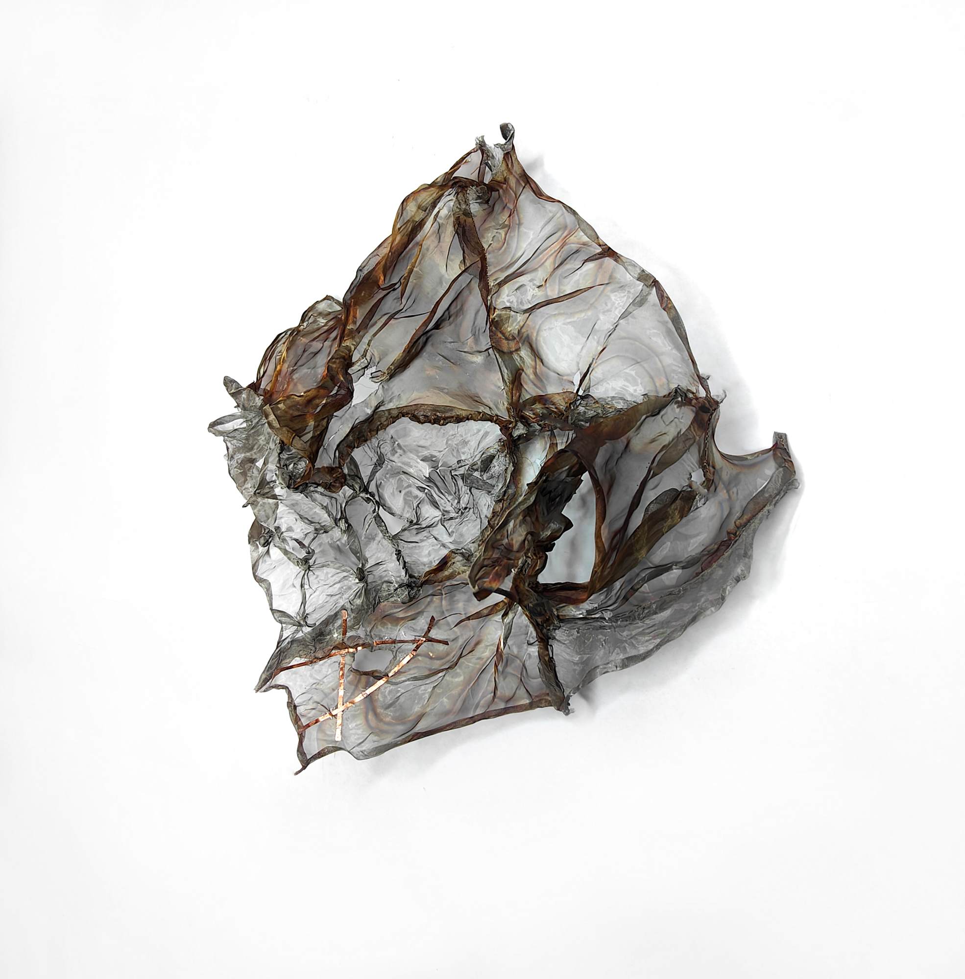 Delicate yet resilient, these sculptural forms are shaped from translucent stainless steel mesh, textured and heat-treated to create shifting tones and subtle shadowplay. Copper threads and fine wirework trace across the surfaces like currents, roots, or signals, suggesting movement, memory, and interconnection. Each piece feels both ephemeral and enduring — like remnants of wind-swept landscapes, tide-worn kelp, or fleeting thoughts caught mid-formation. This series invites reflection on the unseen forces that shape and tether us — light, tension, and time held in delicate balance.