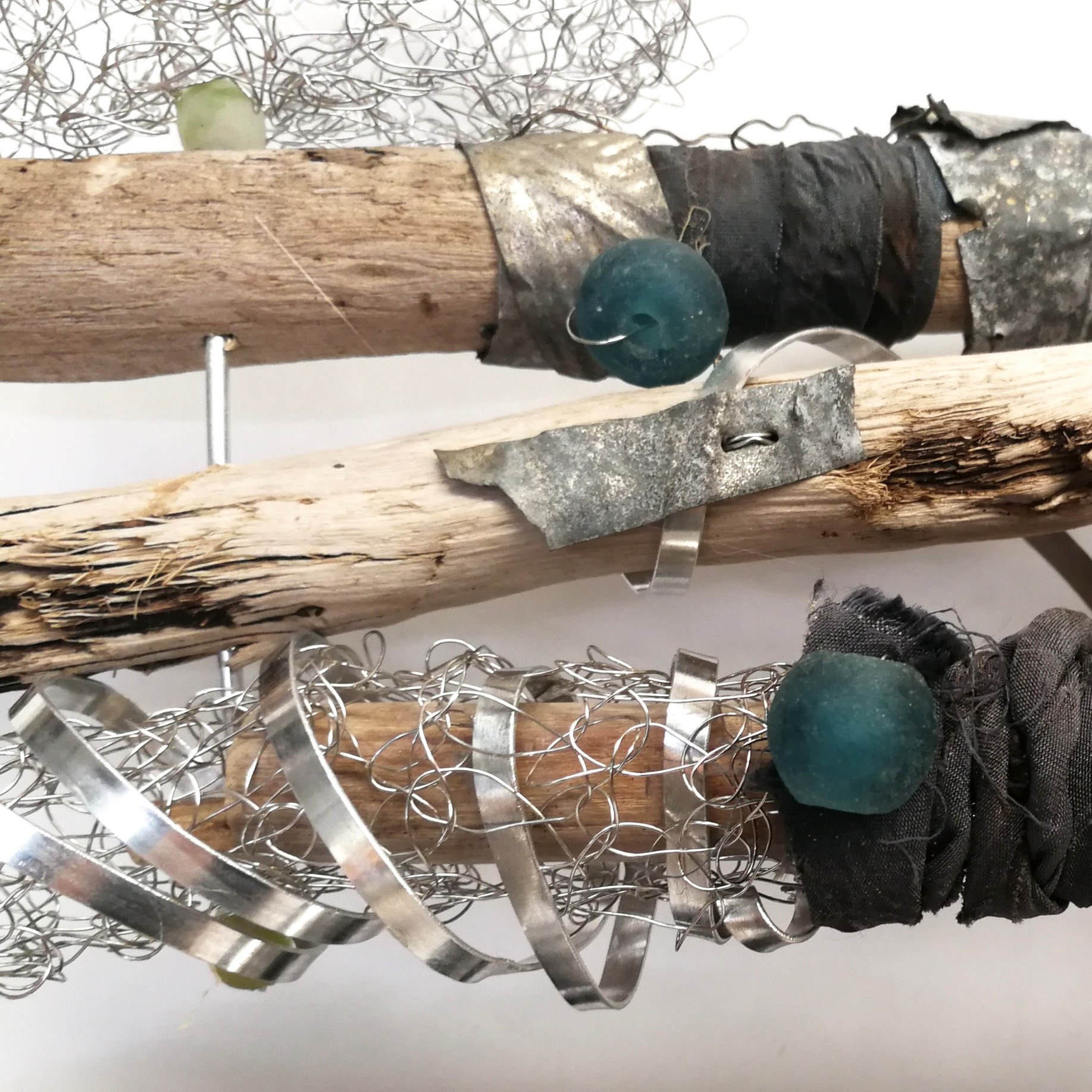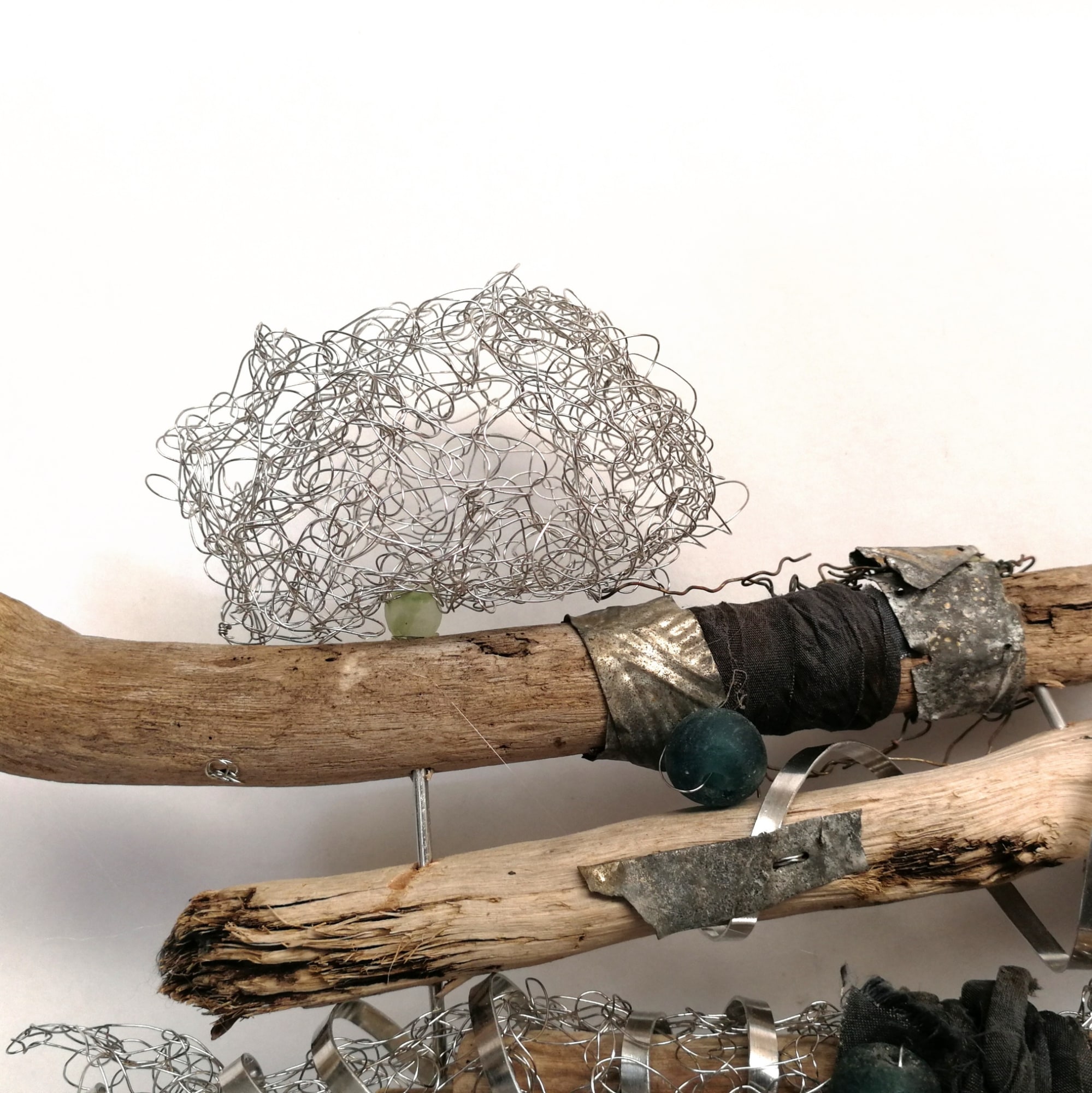 Weaving together driftwood, wire, and textiles, evoking a sense of resilience, connection, and the weathered beauty of nature's rhythms and the passage of time.