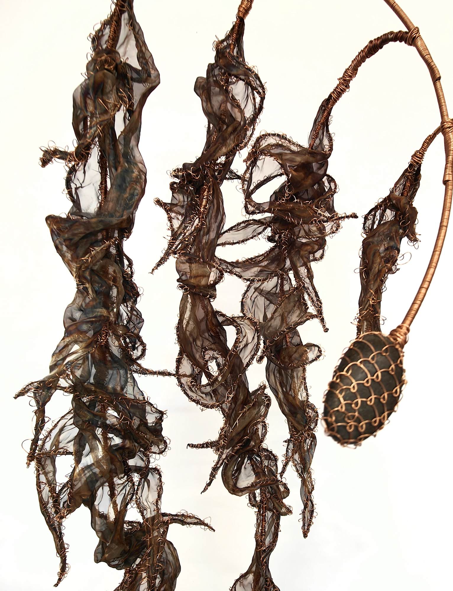 A free hanging textile sculpture in stainless steel, bronze and stone.