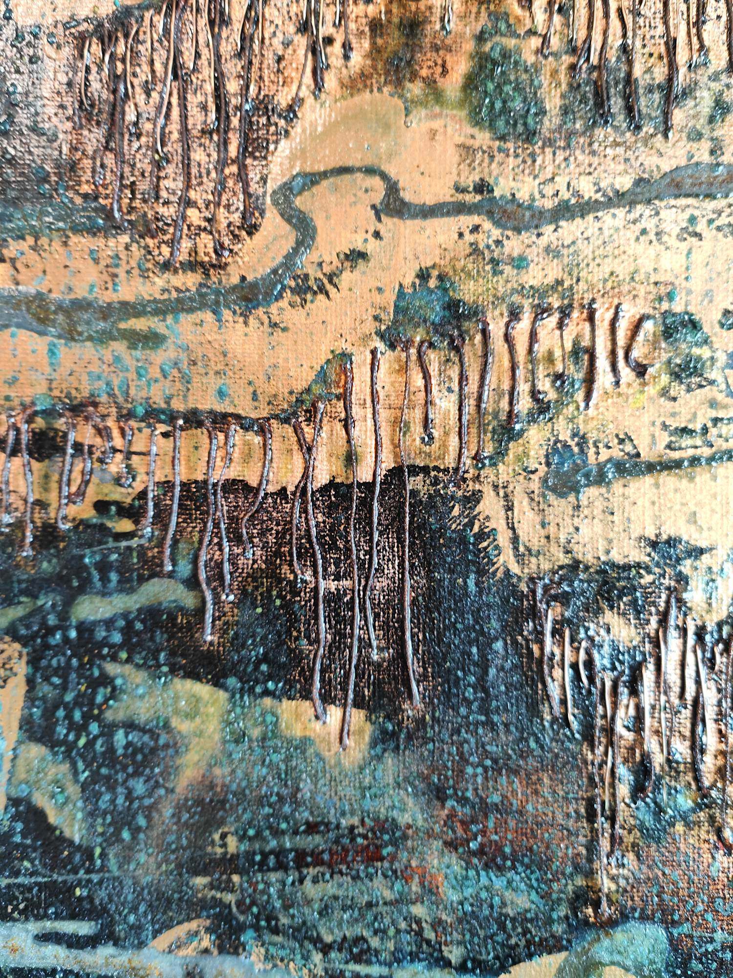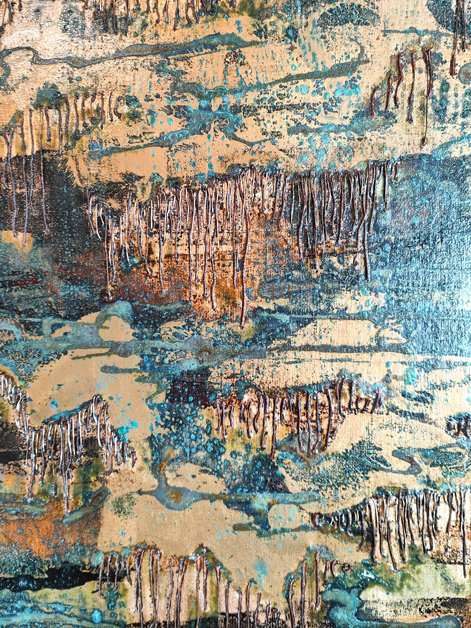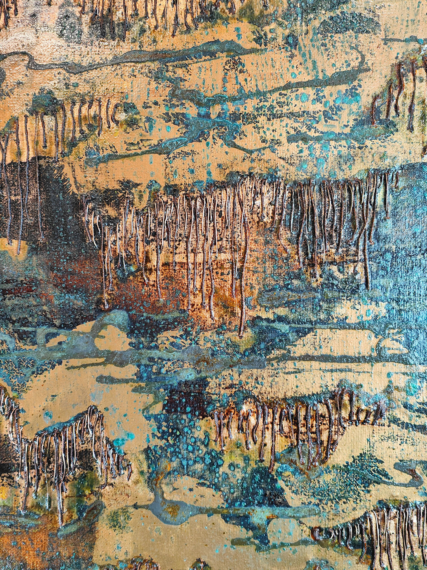 Each of these canvases is covered with gilded surfaces, inks, patinas, and wires in various designs. Wires, including rusted, verdigris, and metallic ones, are layered on top, adding different textures. These works illustrate the interconnectedness of nature through visible and invisible networks.